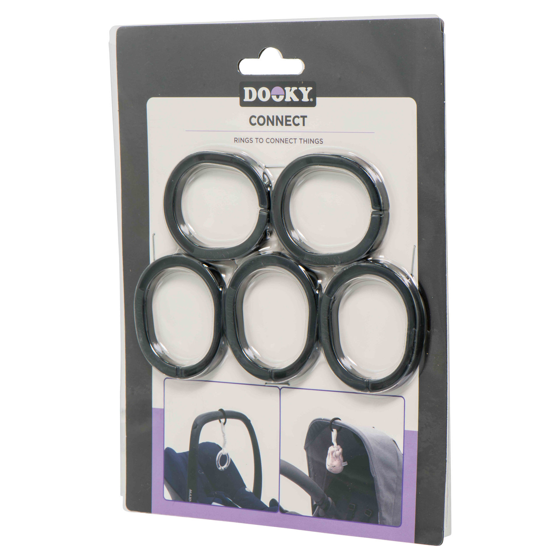Dooky kiinnitysrenkaat ovat monikäyttöiset muovirenkaat, joilla saadaan ripustettua esimerkiksi harsot tai lelut kiinni vaunuihin tai turvakaukaloon. Pakkaus sisältää viisi mustaa rengasta.