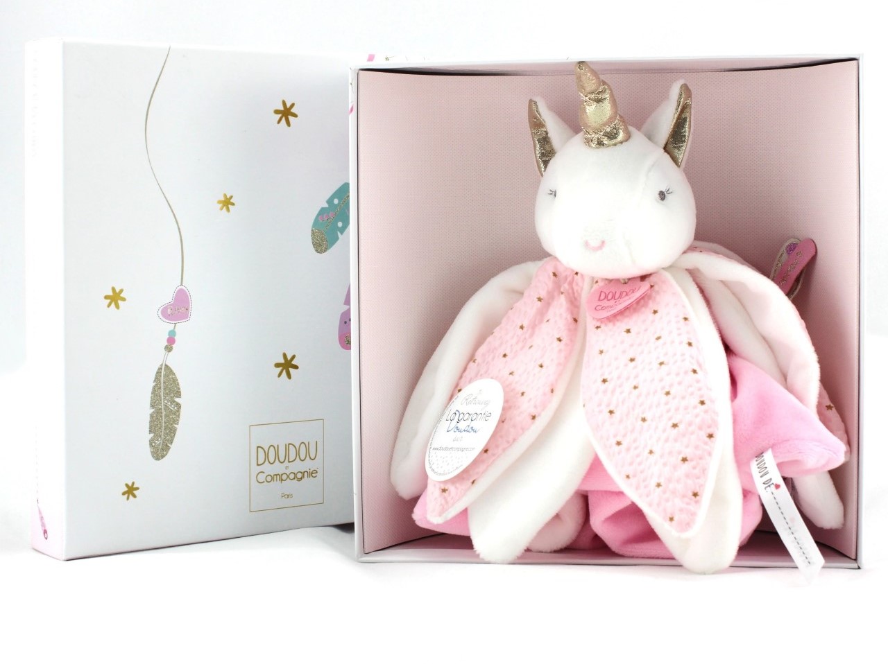 DouDou et Compagnie uniliina on monipuolinen yksisarvisuniliina, jossa on suloinen yksisarvisen pää kultaisella sarvella ja korvan sisuksilla. Uniliinassa on lipareisia osia ja pehmeä liinaosa.