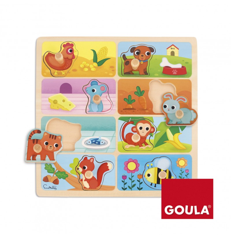Goula nuppipalapeli "Eläinten herkut" on kahdeksan osainen palapeli, jossa eläimet seikkailevat ja katselevat heidän herkkupalojaan. Palapeli on puinen ja siinä on tukevat nupit sekä palaset, jotta pienen on helppo käsitellä niitä.