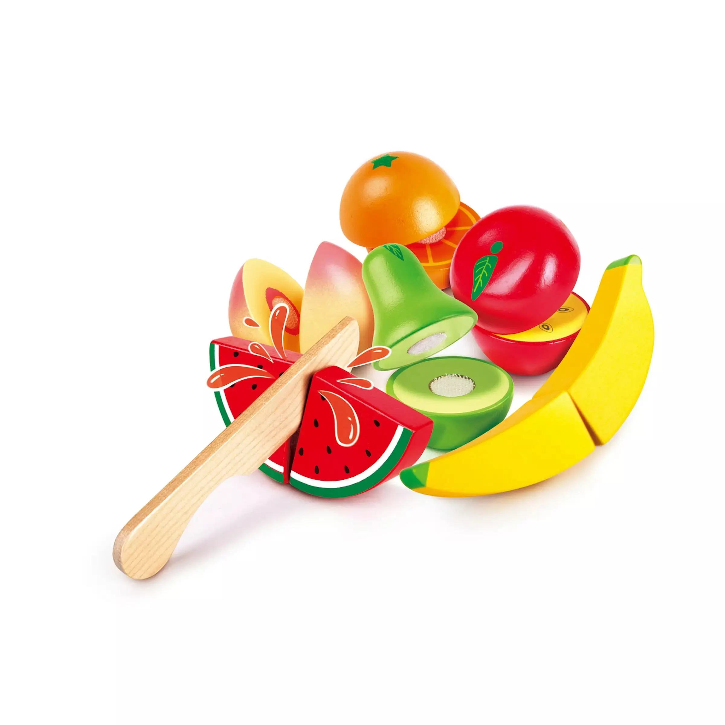 Hape puiset hedelmät -pakkaus sisältää puisia hedelmiä, sekä puisen veitsen, jolla lapsi voi halkaista hedelmät. Hedelmissä on tarrakiinnitys.