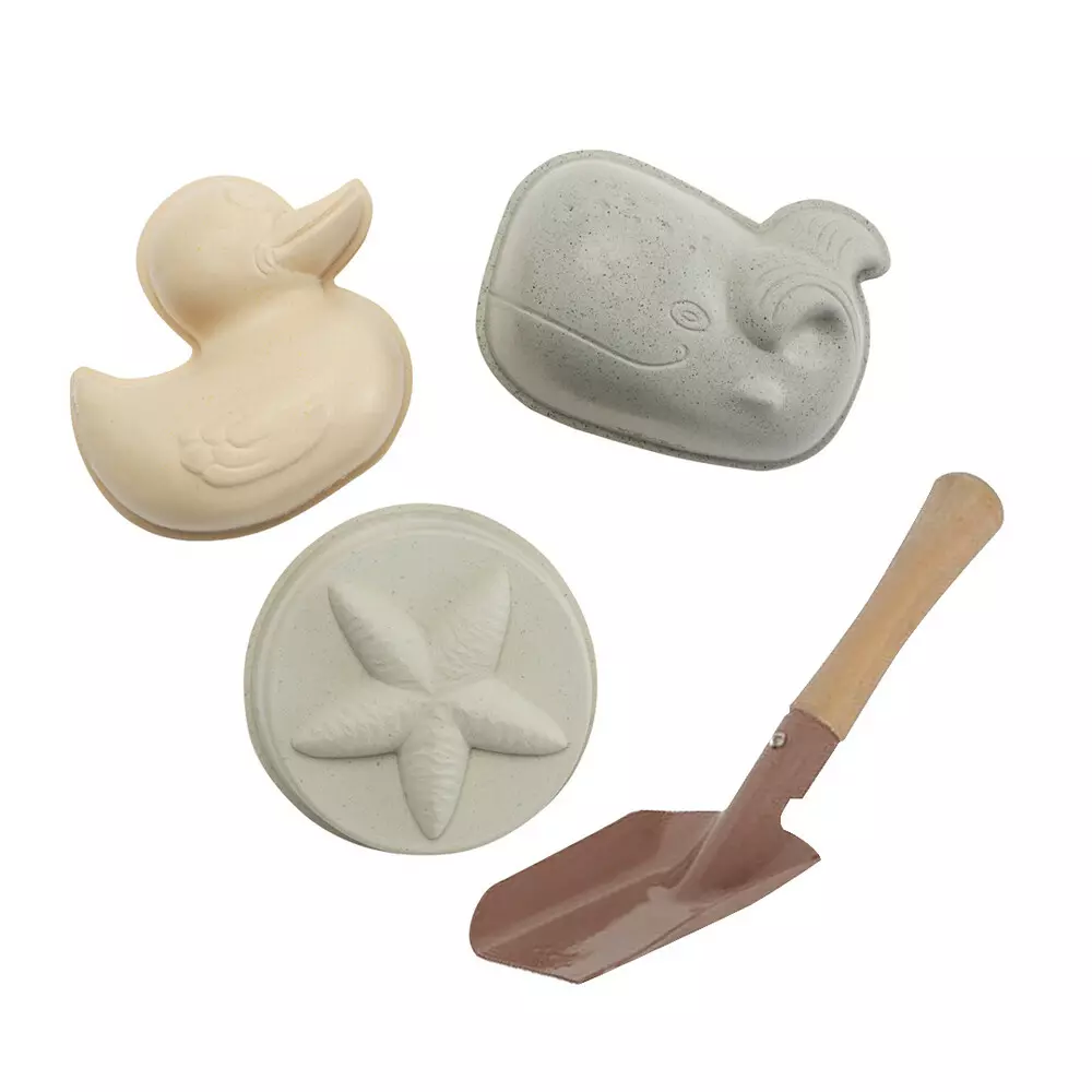Hevea hiekkalelut ja lapio ovat valmistettu luonnonkumista. Lelut on pakattu puuvillaiseen verkkokassiin, joka toimii kätevänä rantakassina.