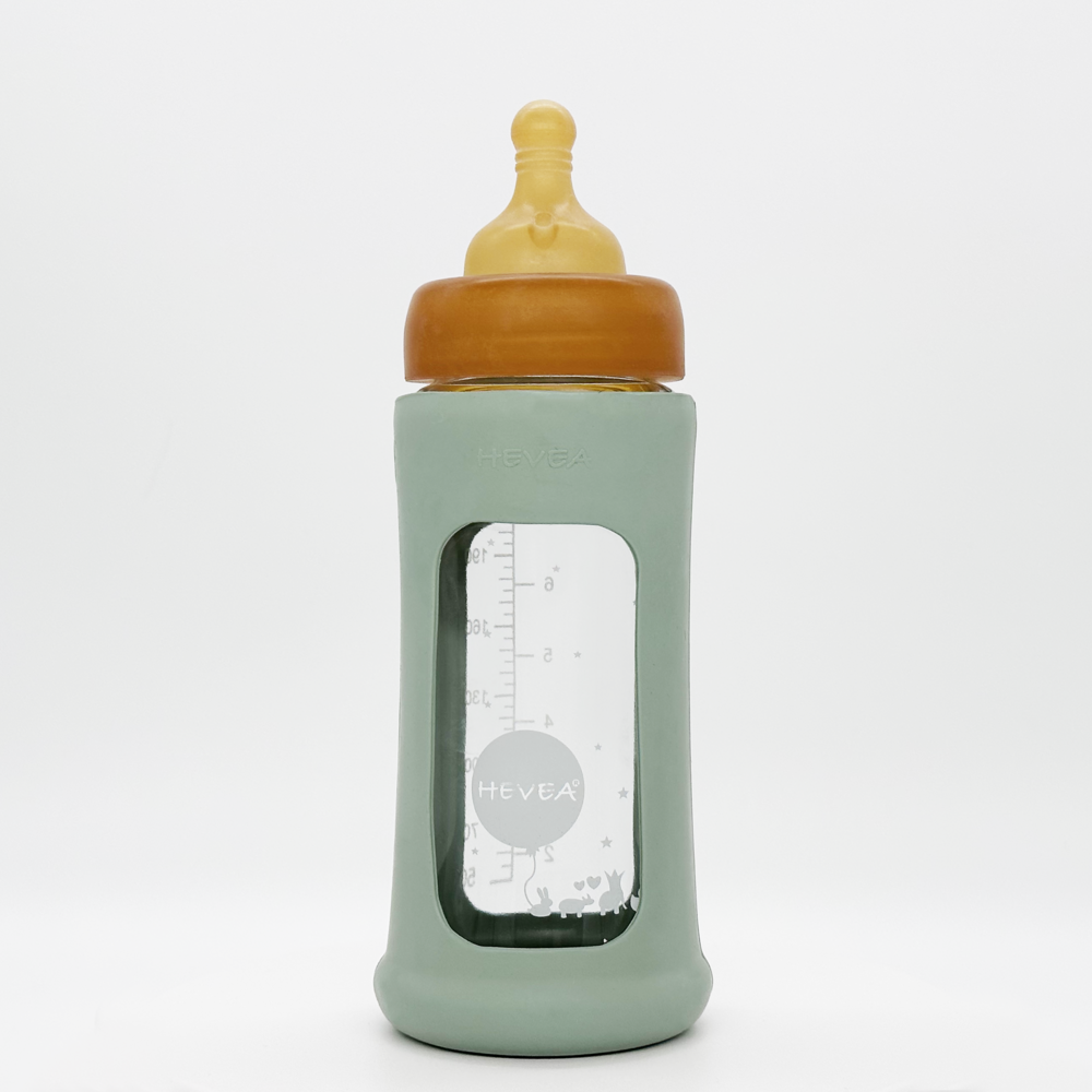 Hevea lasinen tuttipullo 250ml on kaunis tuttipullo, jossa on luonnonkuminen suoja. Luonnonkumi suojaa käsiä vastalämmitetyltä maidolta, sekä suojaa pulloa, jos se tippuu. Kirsikan muotoinen ja kohojuovainen tuttiosa jäljittelee äidin rintaa, ja ennaltaehkäisee koliikkioireita. Tuttiosa sulkee pullon tiiviisti, ja estää vuotamisen. Mukana tulee yksi luonnonkuminen tyhjiösuljettava korkki.