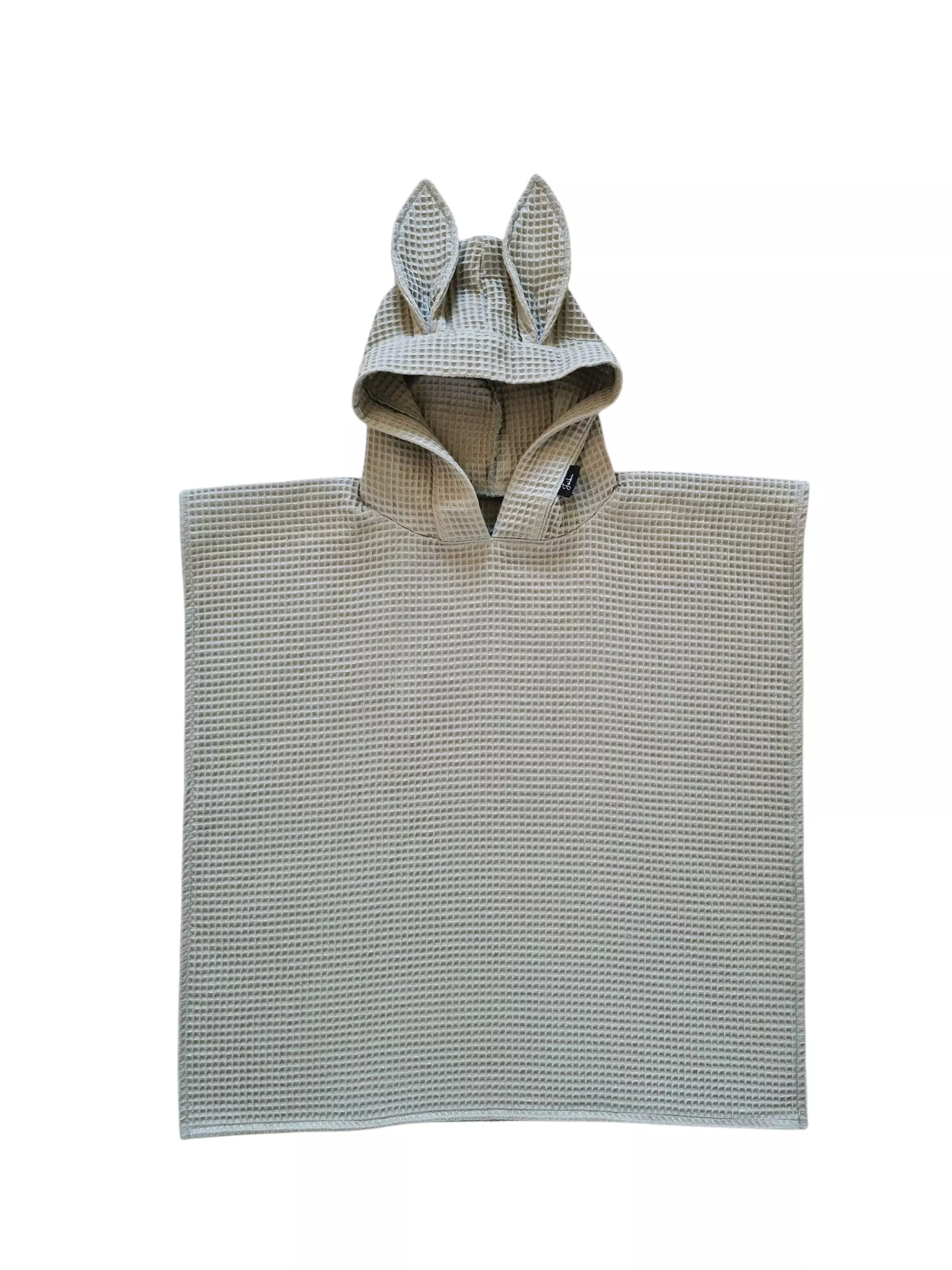 Joiku vohvelikankainen kylpyponcho on valmistettu laadukkaasta ja pehmeästä vohvelikankaasta. Ponchon huppuosassa on söpöt pupunkorva yksityiskohdat. Kylpyponcho on sopiva n. 2-7 vuotiaalle lapselle, jopa 125cm pituuteen asti.