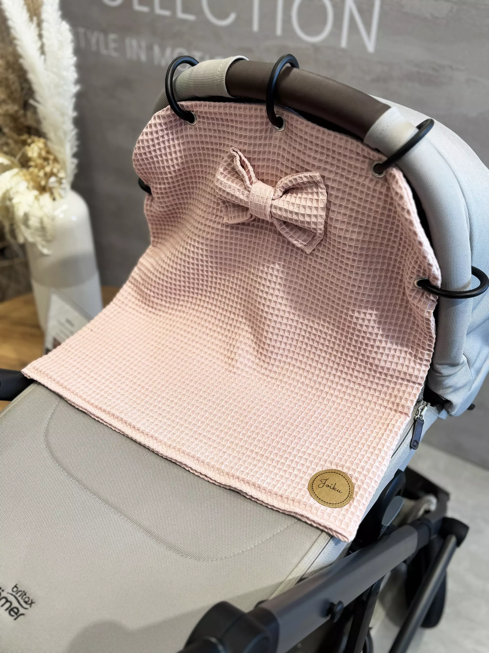 JoiKu vaunuverho on valmistettu pehmeästä vohvelikankaasta, ja siinä on suloinen rusetti. Vaunuverho suojaa lasta valolta ja ärsykkeiltä, kuten ötököiltä, sekä vaimentaa ääniä. Verho on helppo kiinnittää kuomuun kiinni viidellä kiinnityslenkillä, jotka tulevat verhon mukana.