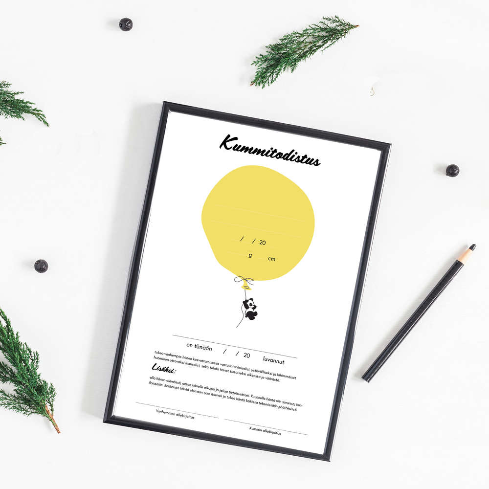 KirpunKoti kummitodistus keltainen panda on kaunis ja valmis pohja, johon täydennetään lapsen ja kummin tiedot osaksi valmista tekstiä. Koko: 20 x 30 cm