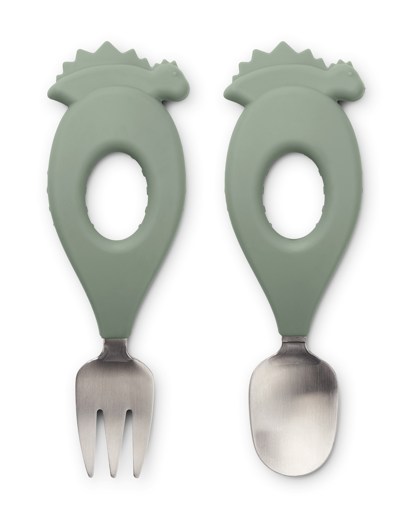 Liewood aterimet 2 kpl sisältää hauskasti muotoillun haarukan ja lusikan. Silikonisesta kahvasta lapsi saa tukevan otteen. Ruostumattomasta teräksestä valmistetut aterimet ovat kestävät, ja ne voidaan pestä astianpesukoneessa.