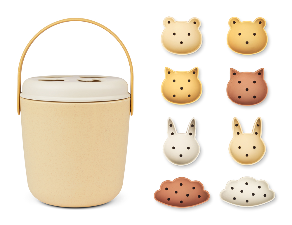 Liewood Jorn palikkalaatikko on monipuolinen lelusetti lapselle. Setti sisältää kannellisen ämpärin sekä kahdeksan erilaista eläinhahmo-muottia, joille lapsi voi etsiä oikean kolon laatikosta. Palikkalaatikko sopii myös hiekka ja- kylpyleikkeihin, sillä muoteissa on reiät, josta voi valuttaa hiekkaa tai vettä.