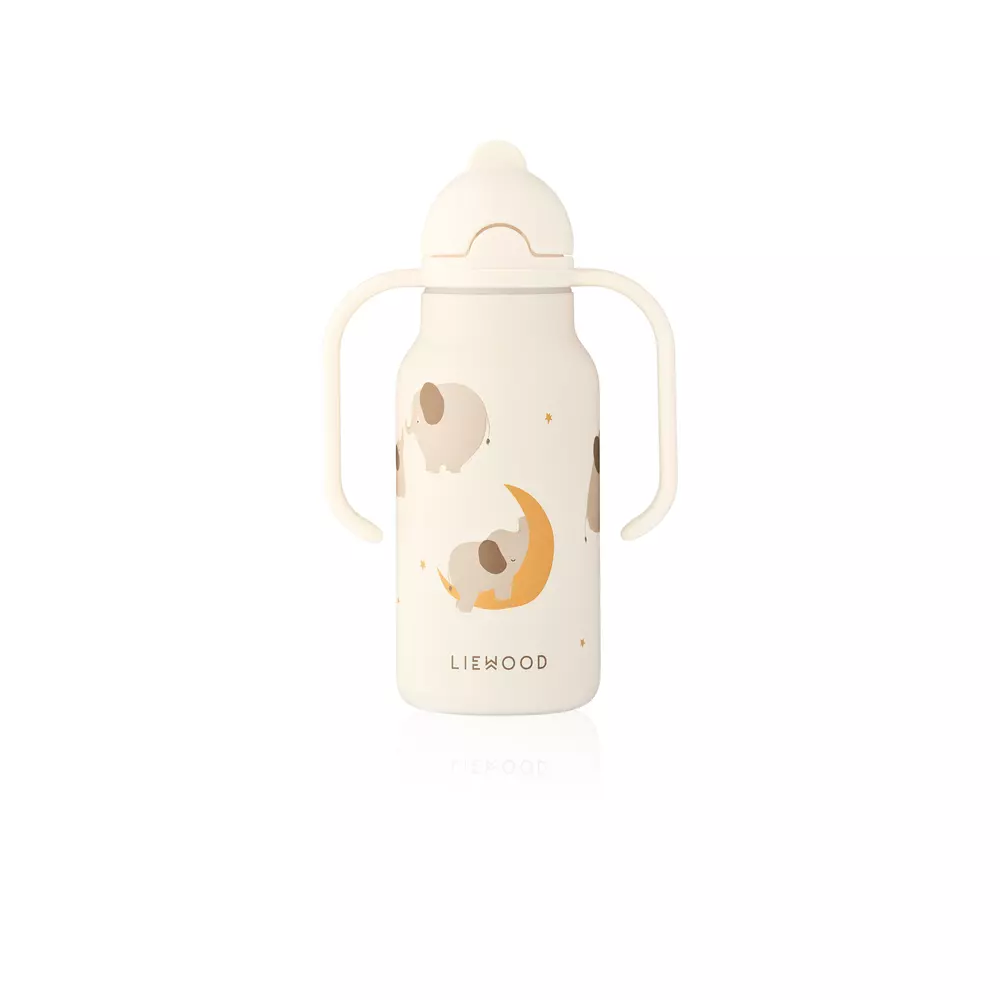 Liewood Kimmie pullo kahvoilla on metallinen pillipullo. Pillin saa taitettua kannen alle, jolloin sitä voi turvallisesti kuljettaa ilman vuotoja. Pullo pitää nesteen kylmänä jopa 12 tuntia, ja kuumana jopa 6 tuntia.
