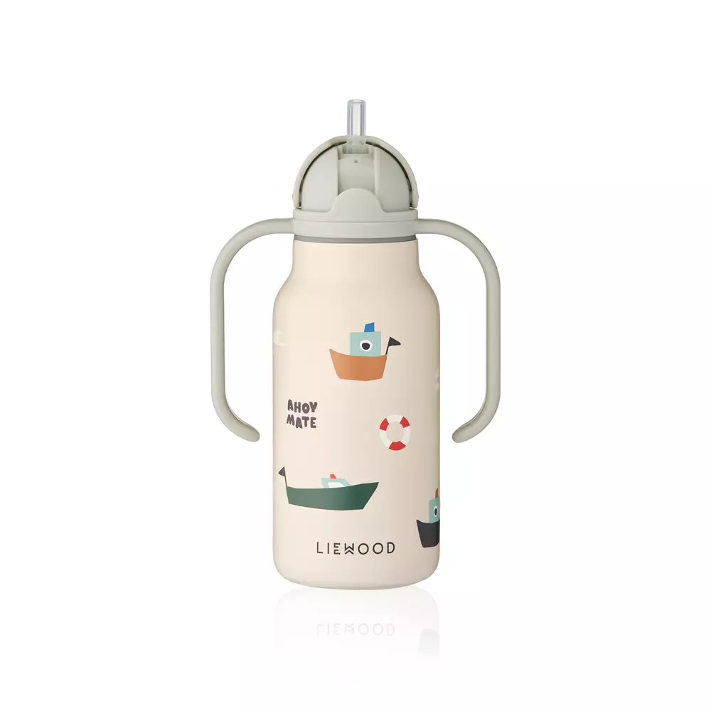 Liewood Kimmie pullo kahvoilla on metallinen pillipullo. Pillin saa taitettua kannen alle, jolloin sitä voi turvallisesti kuljettaa ilman vuotoja. Pullo pitää nesteen kylmänä jopa 12 tuntia, ja kuumana jopa 6 tuntia.