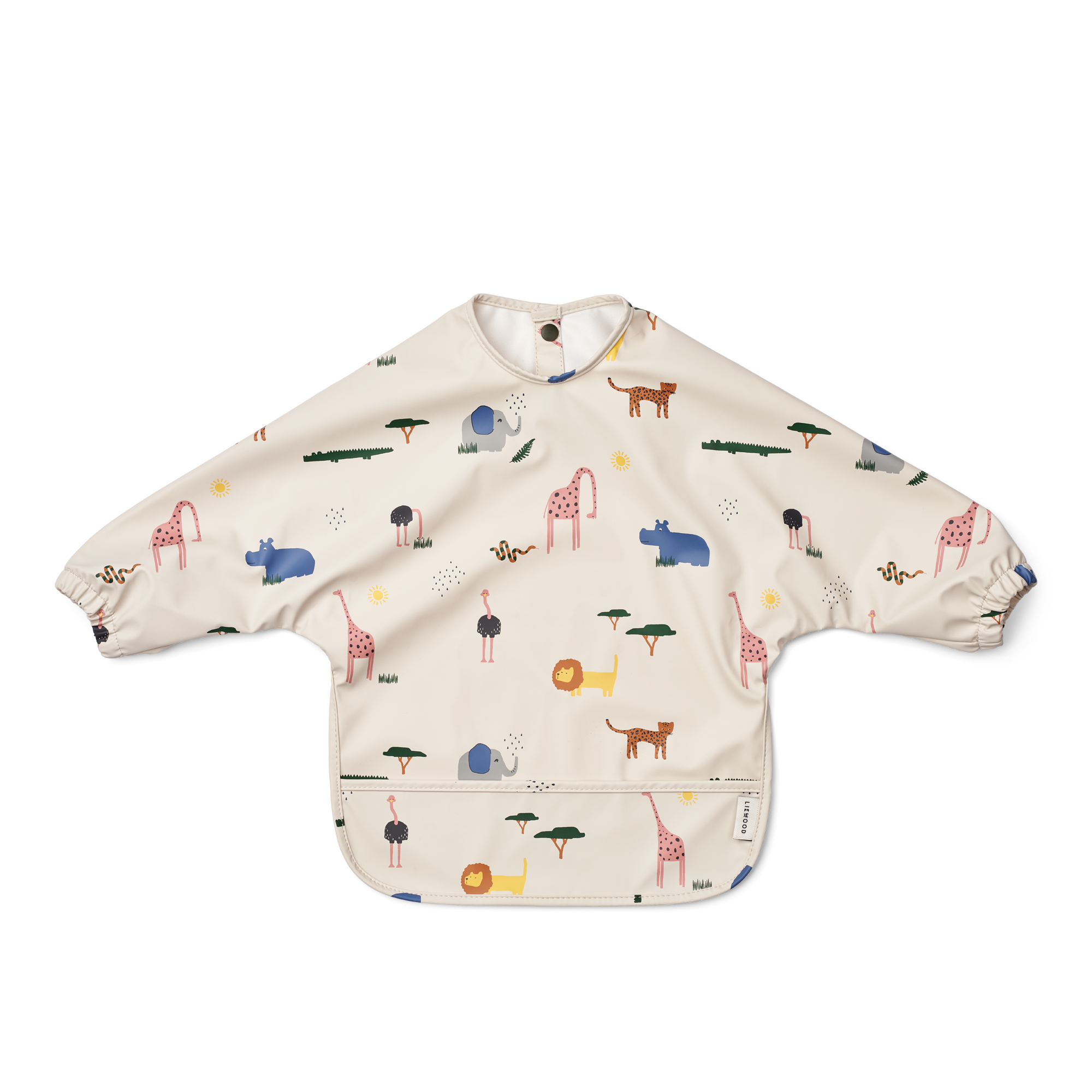 Liewood Merle hihallinen ruokalappu antaa laajan suojan. Ruokalapun kangas hylkii likaa ja se on pehmeää. Pitkien hihojen päissä on kuminauharesorit sekä ruokalapussa on kouru tippuvalle ruoalle. Ruokalappu saadaan tukevasti kiinni kahdella nepparilla.