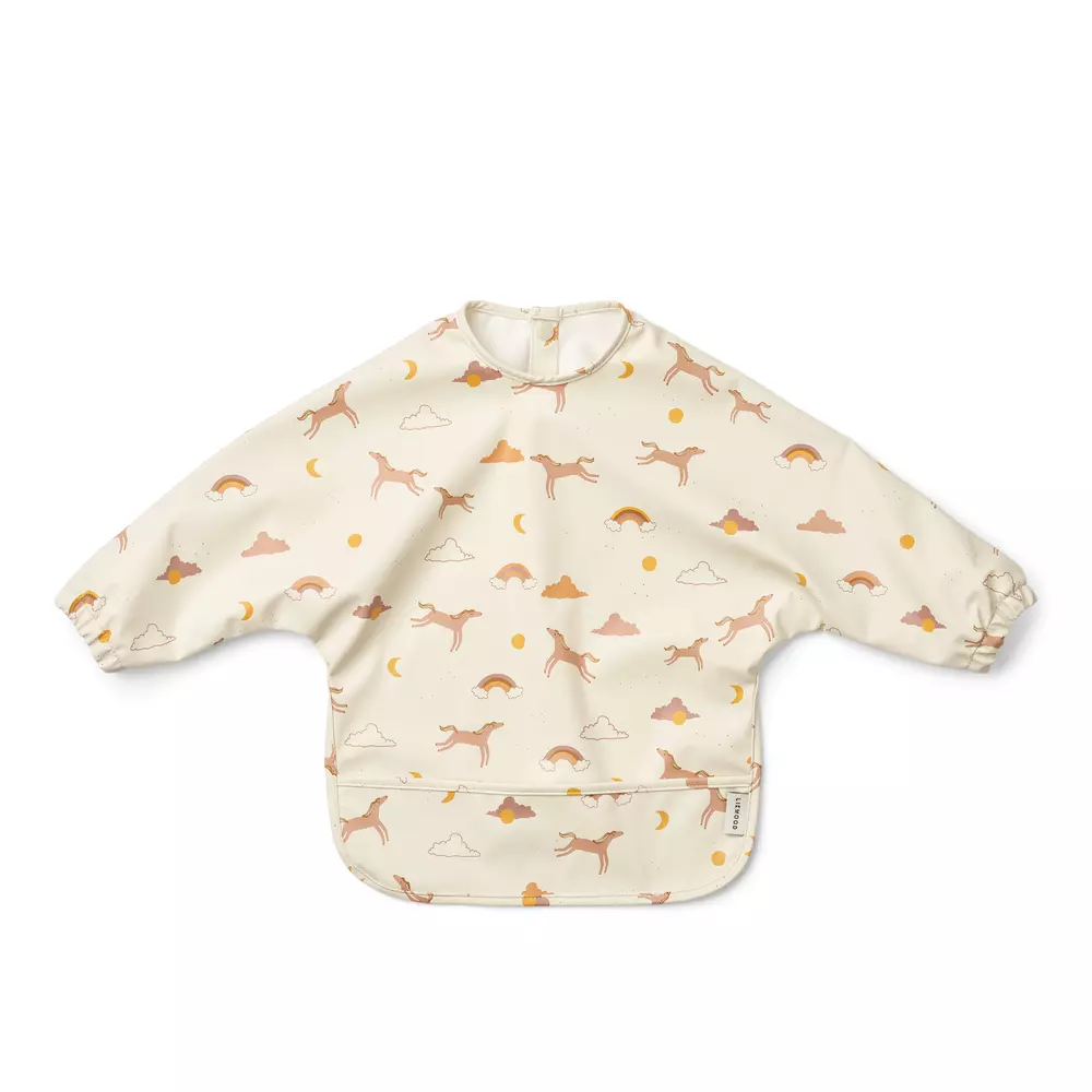 Liewood hihallinen ruokalappu antaa laajan suojan. Ruokalapun kangas hylkii likaa ja se on pehmeää. Pitkien hihojen päissä on kuminauharesorit sekä ruokalapussa on kouru tippuvalle ruoalle. Ruokalappu saadaan tukevasti kiinni kahdella nepparilla.