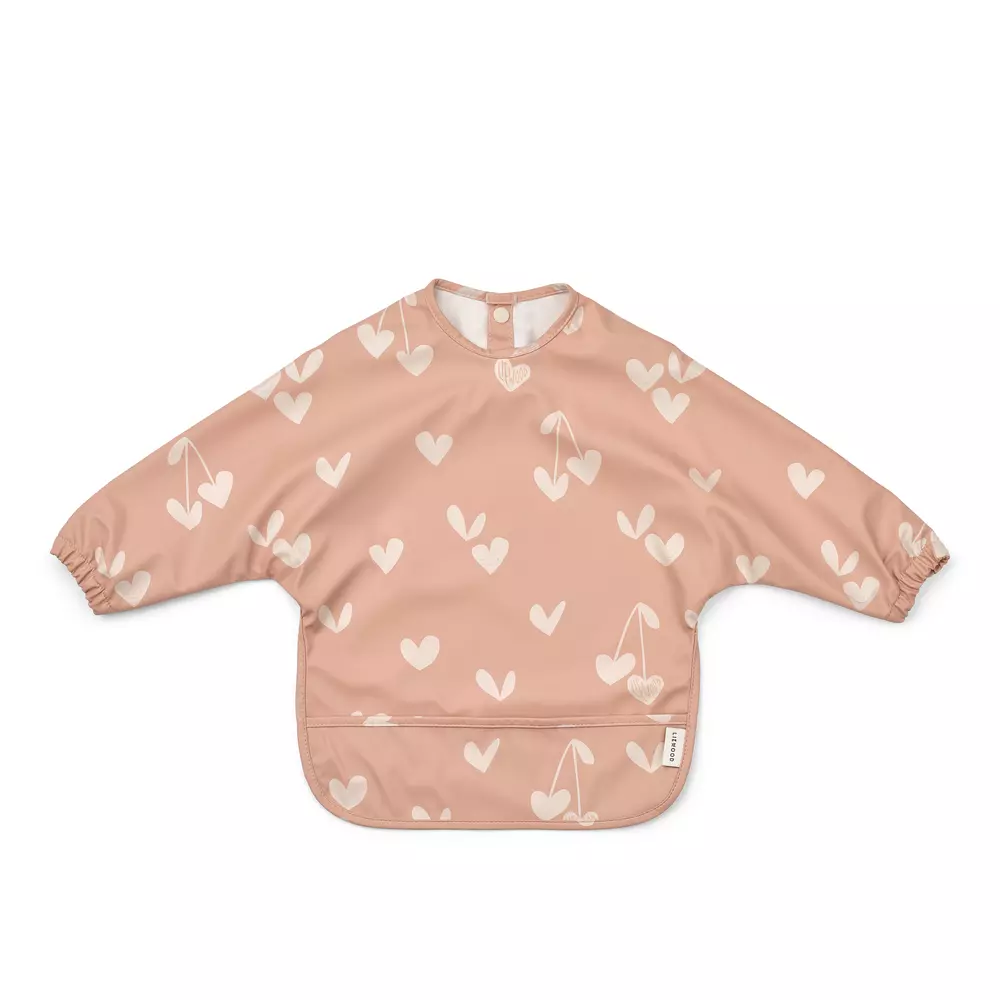 Liewood hihallinen ruokalappu antaa laajan suojan. Ruokalapun kangas hylkii likaa ja se on pehmeää. Pitkien hihojen päissä on kuminauharesorit sekä ruokalapussa on kouru tippuvalle ruoalle. Ruokalappu saadaan tukevasti kiinni kahdella nepparilla.