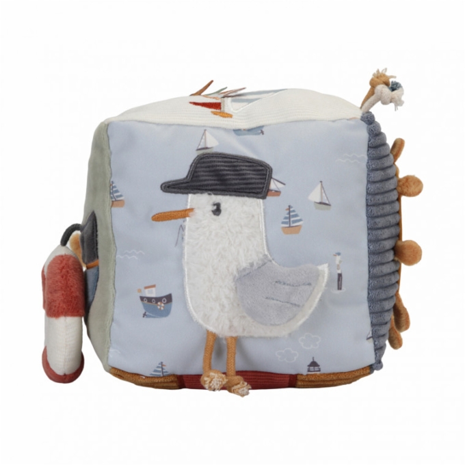 Little Dutch aktiviteettikuutio on pehmeä ja monipuolinen kuutio, jonka jokaisella sivulla on joku aktiviteetti. Hempeän pastellinsävyisessä lelussa on käytetty erilaisia materiaaleja ja siinä on muun aurinkopeili, joka on vauvaturvallinen, erilaisia nauhoja sekä nauhan päässä pelastusrengas, josta vauva voi pitää kiinni. Lelu helisee heilutettaessa. Aktiviteetit stimuloivat vauvan aisteja.