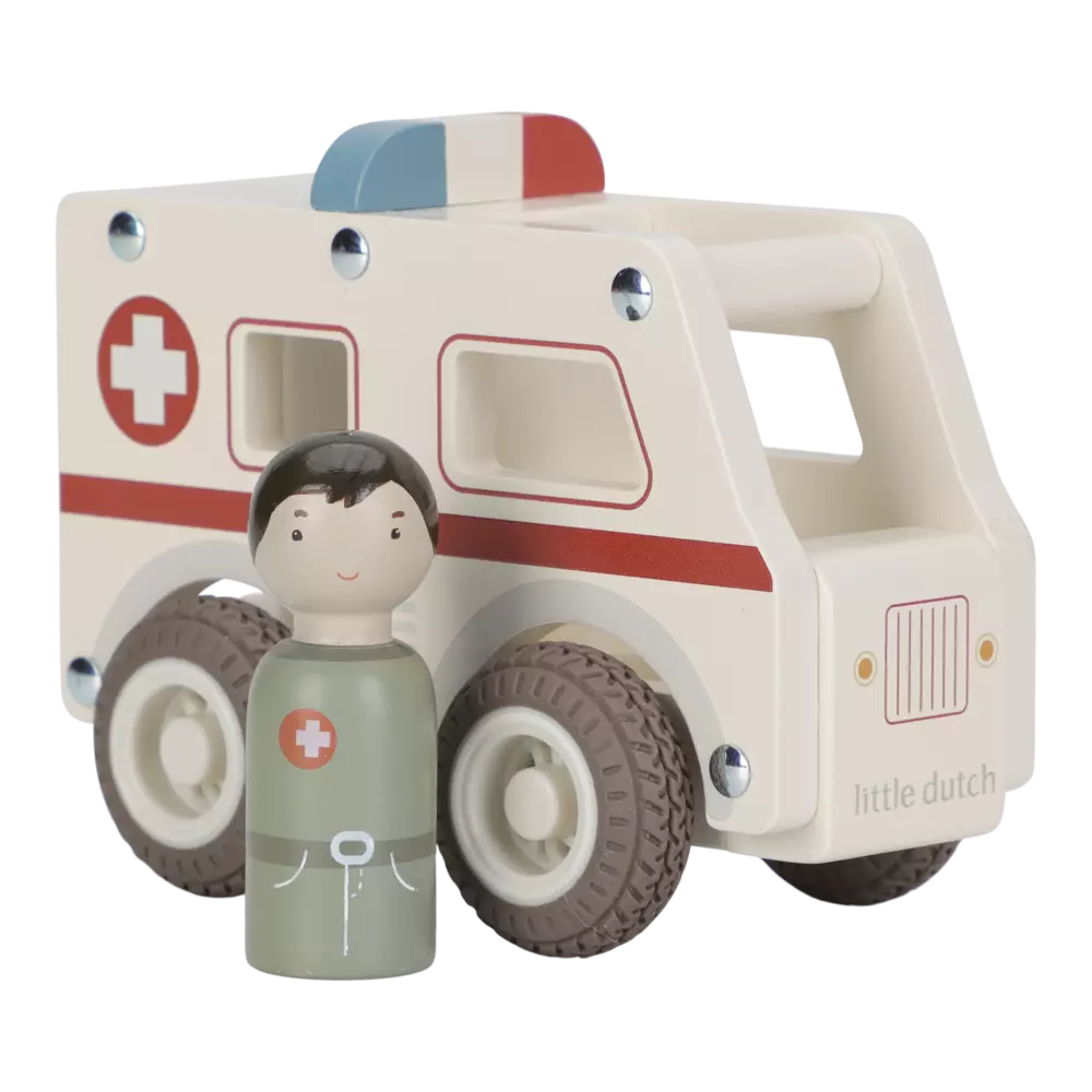 Little Dutch ambulanssi hahmolla on puinen ambulanssi, jonka mukana tulee kuljettaja. Lelu kehittää lapsen hienomotorisia taitoja sekä koordinaatiokykyä.