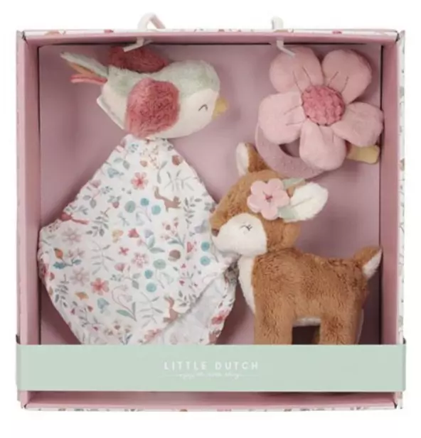 Little Dutch lahjapakkaus sisältää metsäaiheisen rengashelistimen, uniliinan sekä pehmolelun. Tuotteet on pakattu kauniiseen lahjarasiaan, joka on ihana lahja esimerkiksi vauvakutsuille.