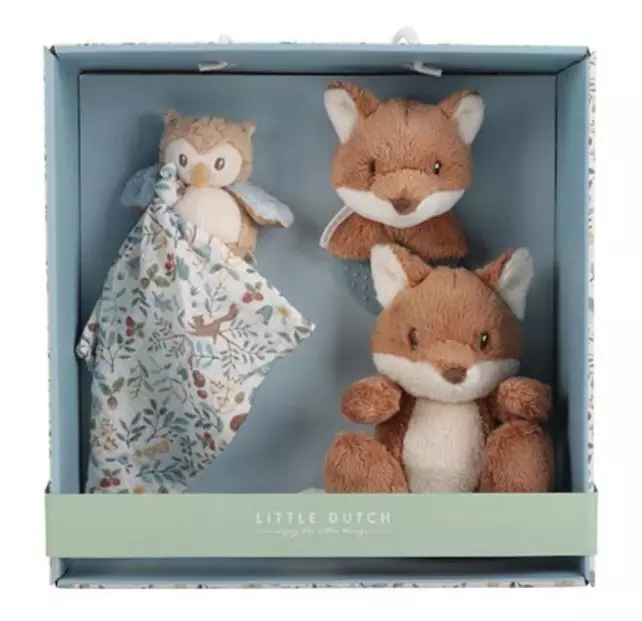 Little Dutch lahjapakkaus sisältää metsäaiheisen rengashelistimen, uniliinan sekä pehmolelun. Tuotteet on pakattu kauniiseen lahjarasiaan, joka on ihana lahja esimerkiksi vauvakutsuille.