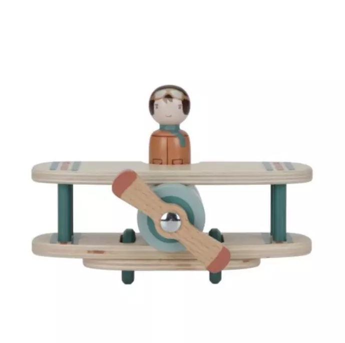 Little Dutch lentokone on hauska lelu lapselle. Puisen lentokoneen kyydissä on pilotti, jonka saa irroitettua koneesta, ja koneen edessä on pyörivä propelli. Pastellin värinen lentokone on myös kaunis sisustuselementti lapsen huoneessa.