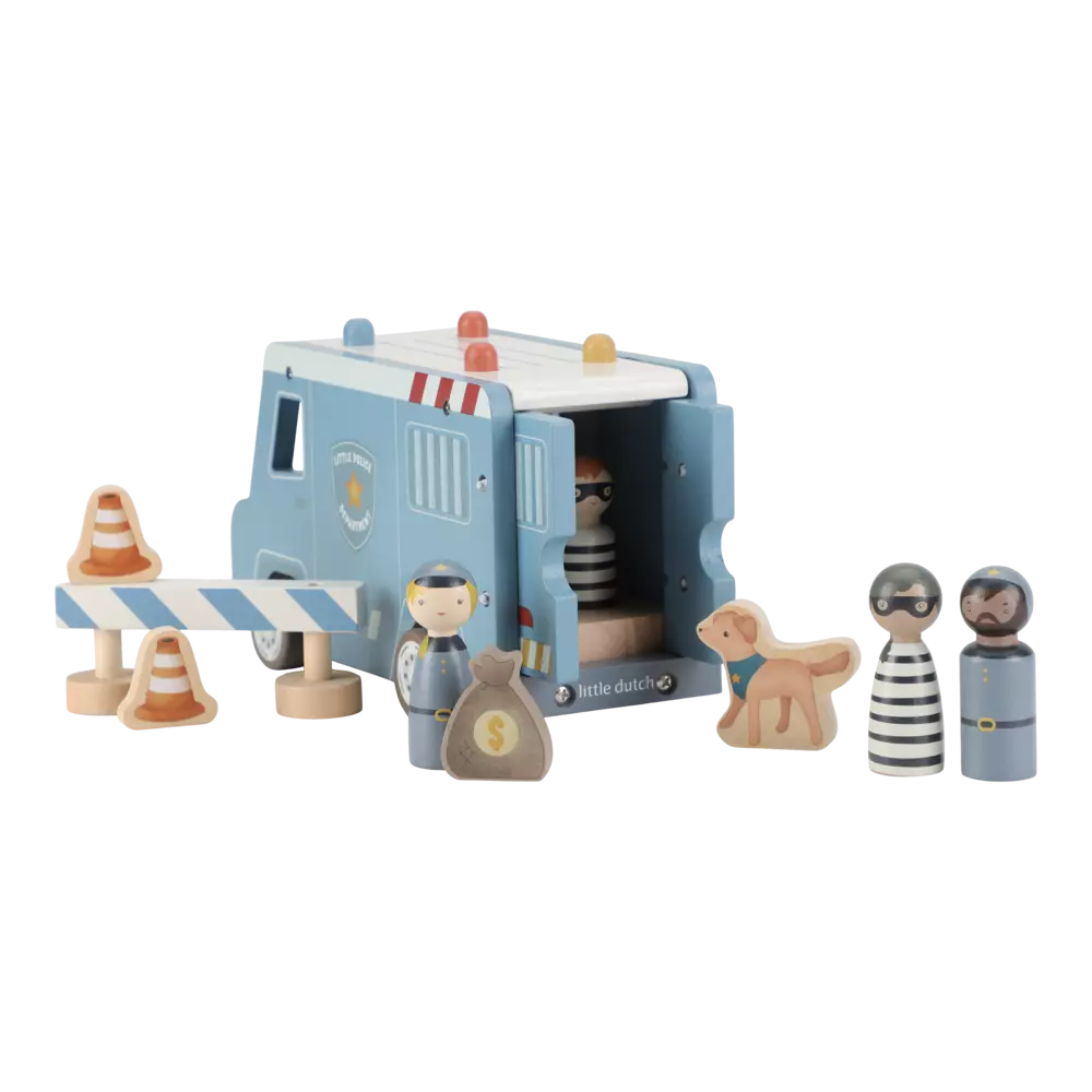 Little Dutch poliisiauto on valmistettu laadukkaasta puusta, ja sen mukana tulee kaksi hahmoa ja tarvikkeita. Lelu kehittää lapsen hienomotorisia taitoja sekä koordinaatiokykyä.