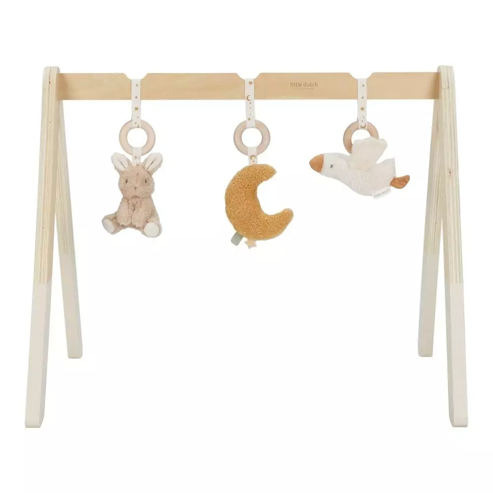 Little Dutch puinen vauvajumppa/leikkikaari on tarkoitettu vauvan ensimmäiselle puolelle vuodelle viihdyttämään häntä. Leikkikaari on valmistettu tukevasta puusta ja sen mukana tulee kolme lelua, pupu, kuu ja hanhi. Vauvajumppa leluineen kehittää lapsen käden ja silmän yhteistyötä ja stimuloi aisteja.