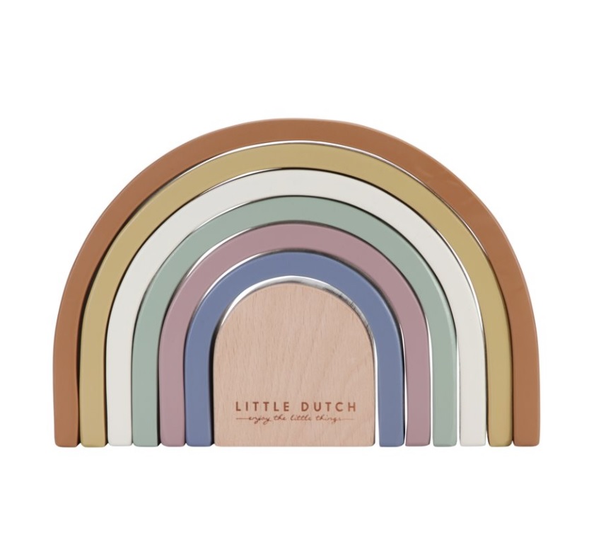 Little Dutch puinen sateenkaaripuu on uudenlainen pinoamistorni. Se on muodoltaan ja väriltään kaunis sateenkaari. Lapset oppivat ja pääsevät leikkimään näiden puolikuunmallisten kaarien avulla. Setissä on kahdeksan palaa.