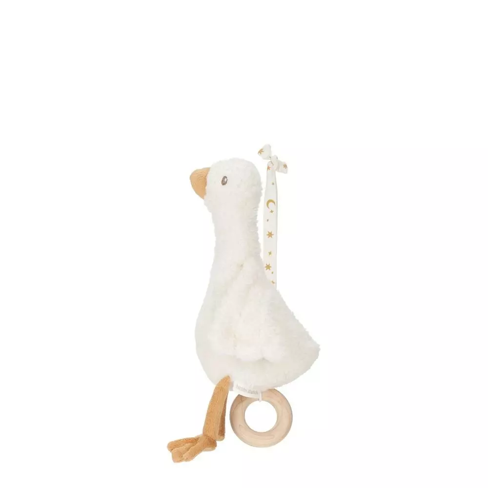 Little Dutch Newborn Naturals soittorasia on pehmeä hanhi, joka soittaa puisesta renkaasta vetämällä rauhoittavaa tuutulaulua. Hanhessa olevasta narusta soittorasian saa roikkumaan esim. pinnasänkyyn tai turvakaukaloon.