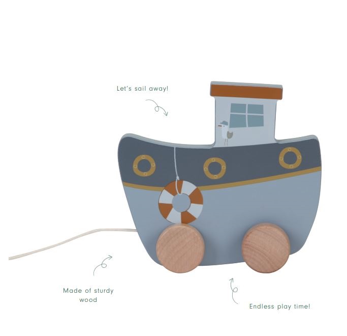 Little Dutch vedettävä laiva on valmistettu kestävästä puusta. Laivassa on puiset renkaat, sekä vetonaru. Lelun kanssa leikkiessä lapsen koordinaatiokyky kehittyy.
