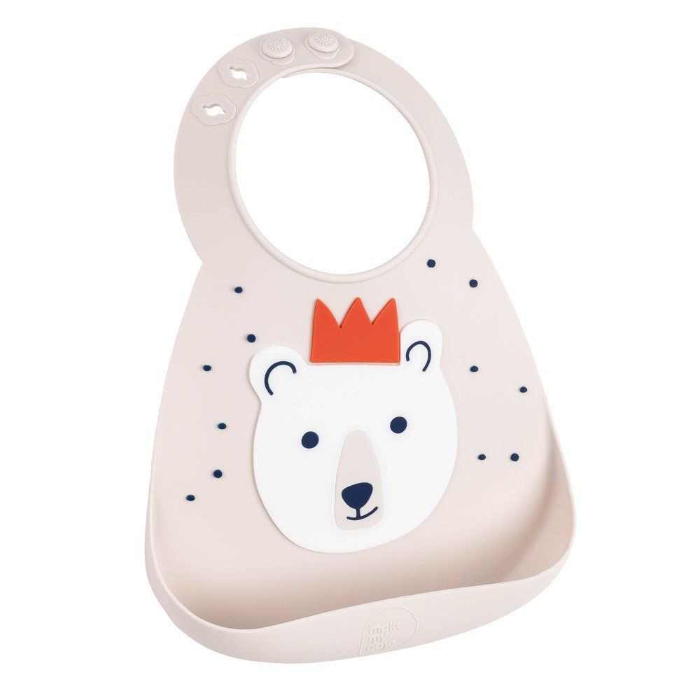 Make My Day silikoninen ruokalappu on ihanan pehmeä ja kulutusta kestävä ruokalappu. Se on valmistettu 100% BPA-vapaasta silikonista, joka hylkii likaa ja se voidaan pestä astianpesukoneessa. Ruokalapussa on myös kouru, johon tippuva ruoka putoaa. Ruokalapun materiaali on niin pehmeää, että se saadaan rullattua kasaan.
