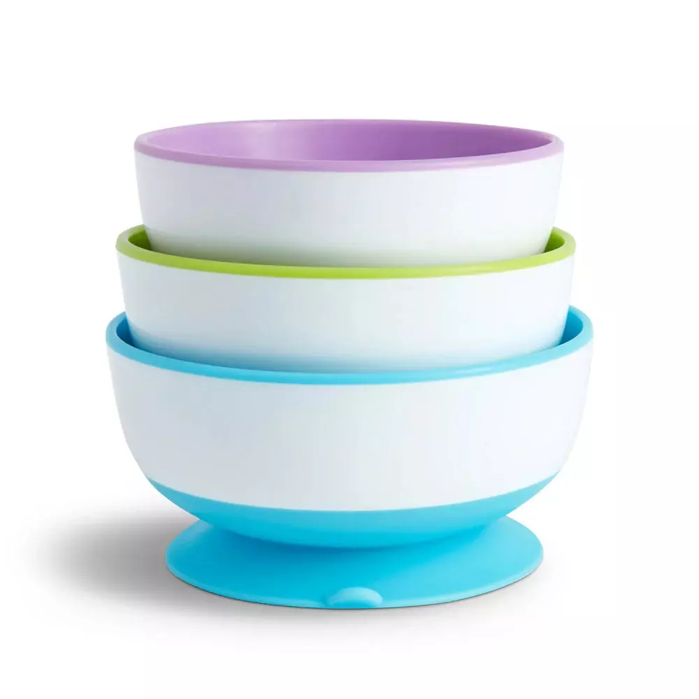 Munchkin kulho imukupilla 3 Stay-Put Suction Bowls on kolmen erikokoisen imukupeilla pöytään kiinnitettävän kulhon setti. Kulhoissa on sopiva muotoilu, joka helpottaa lasta ruokailussa.