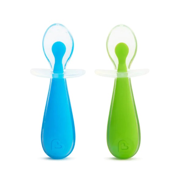 Munchkin silikoninen lusikka on valmistettu pehmeästä silikonista ja se tuntuu miellyttävältä suussa. Lusikan varressa on korkea suoja, joka estää lusikkaa pääsemästä liian syvälle lapsen suuhun. Lisäksi kun lusikka on pöydällä, estää suoja sen kärkeä koskemasta pöytätasoon. Kahva on ergonomisesti muotoiltu ja sopii hyvin lapsen käteen. Pakkaus sisältää 2 kappaletta lusikoita.