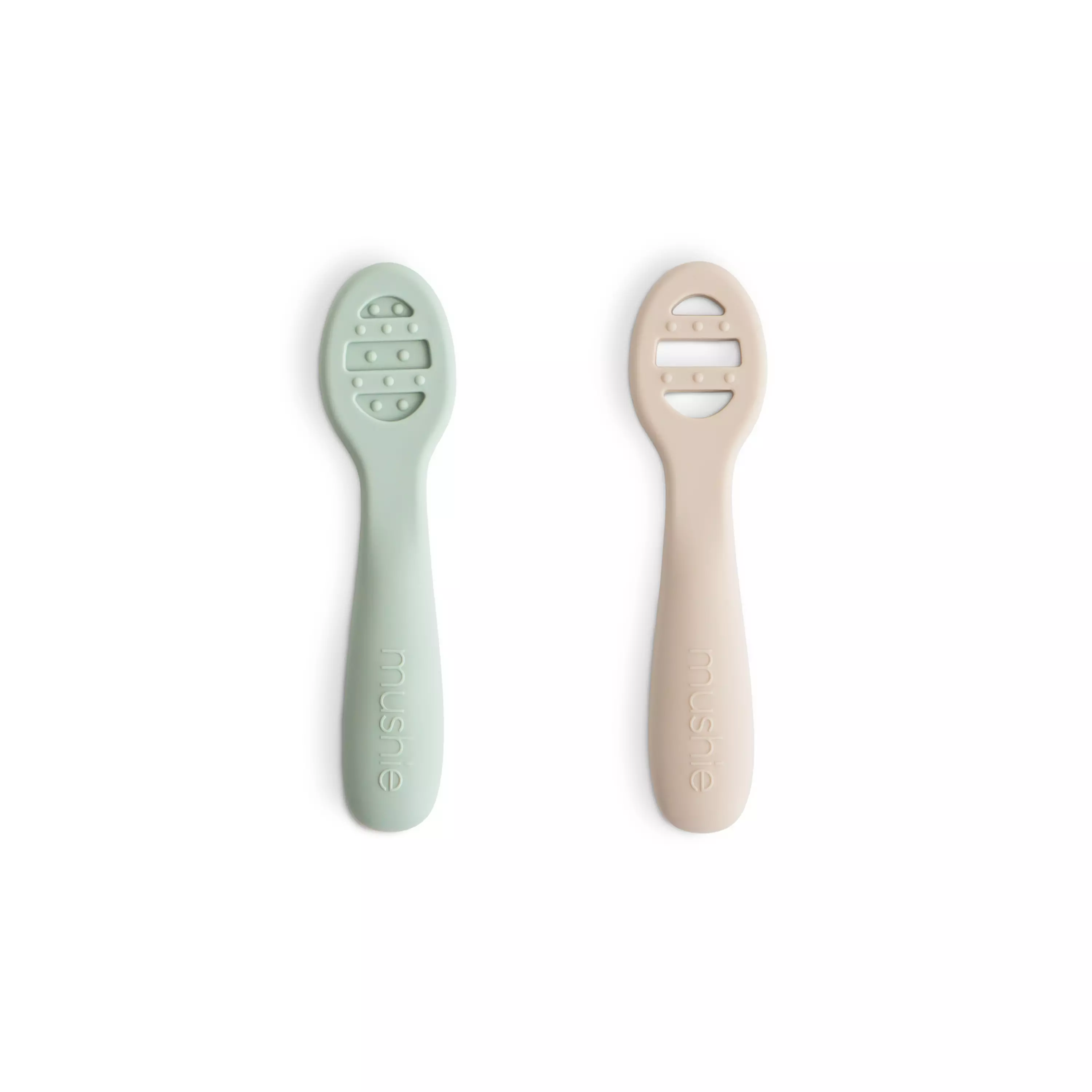 Mushie silikoniset ensilusikat sopivat lapsen itsenäisen ruokailun opetteluun. Pakkaus sisältää kaksi lusikkaa, joista toinen ilman reikiä soveltuu esim. soseille ja jugurtille. Reiällinen lusikka sopii erityisesti esim. puuroille ja perunamuusille. Lusikoissa on pieniä nystyröitä, jotka helpottavat kutiavia ikeniä. Litteistä lusikoista on helppo ottaa kiinni.