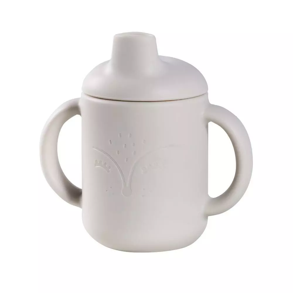 Nordbaby silikoninen nokkamuki on kaksikahvainen muki, josta pienempikin lapsi saa hyvän otteen. Pehmeä silikoni on miellyttävän tuntuinen, ja kevyestä mukista on helppo pitää kiinni. Mukissa on suloinen kettukuviointi, ja sitä pystyy myöhemmin käyttämään myös ilman kantta.