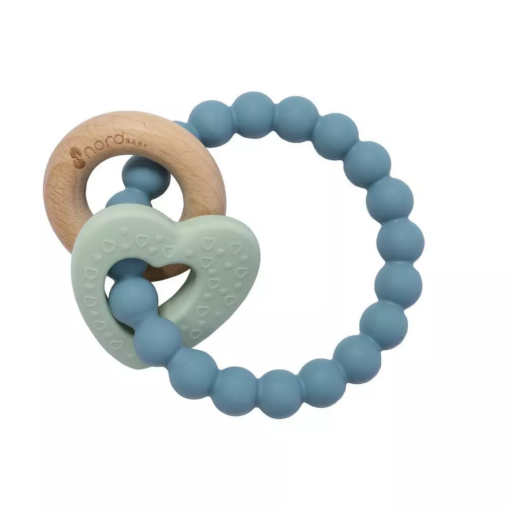 Nordbaby silikoninen purulelu helpottaa vauvan kutisevia ikeniä. Purulelusta on helppo pitää kiinni, ja siinä on myös kaksi pienempää rengasta, joista toinen on puinen. Purulelu on valmistettu elintarvikelaatuisesta silikonista-