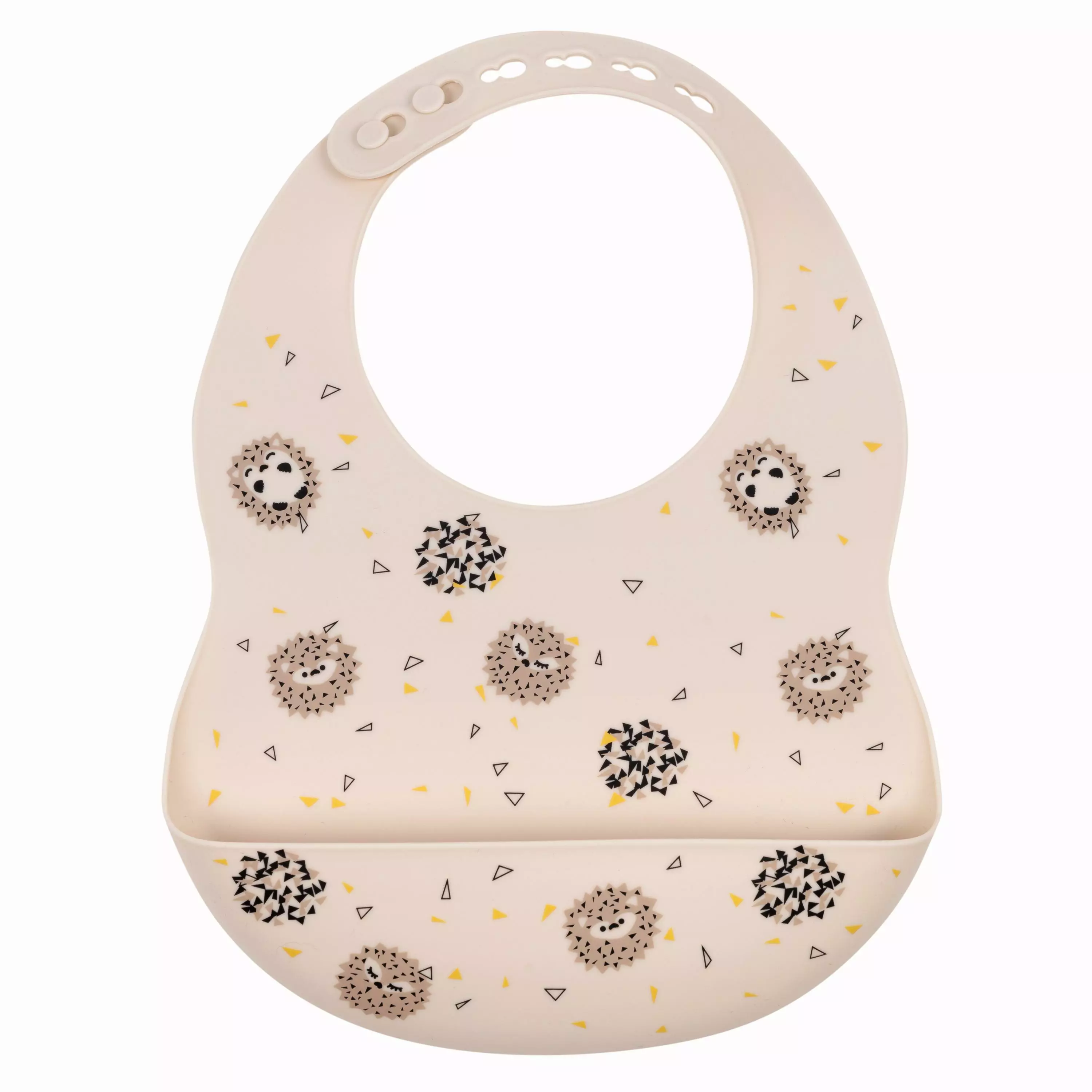 Nordbaby silikoninen ruokalappu on pehmeä ja laadukas ruokalappu lapselle. Elintarvikelaatuisesta silikonista valmistettu ruokalappu suojaa lasta ruokaillessa, ja kätevä kouru kerää tippuneet ruoat. Ruokalappu saadaan säädettyä niskasta sopivaksi. Ruokalapussa on suloisia siilejä.