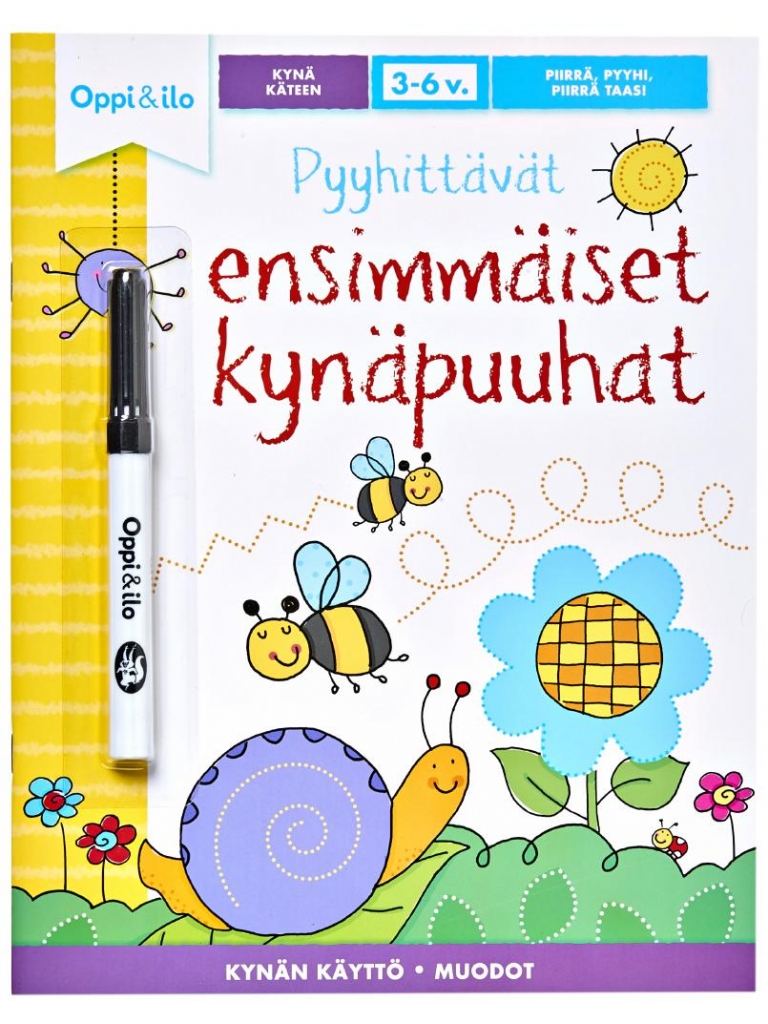 Oppi ja ilo "Ensimmäiset kynäpuuhat" -puuhakirja on tarkoitettu noin 3-6 -vuotiaille lapsille. Puuhakirjan avulla lapsi oppii kynänkäyttöä ja tuttuja perusmuotoja. Puuhakirjan mukana tulee poispyyhittävä tussi, jonka kanssa tehtävät voi tehdä aina uudelleen ja uudelleen.
