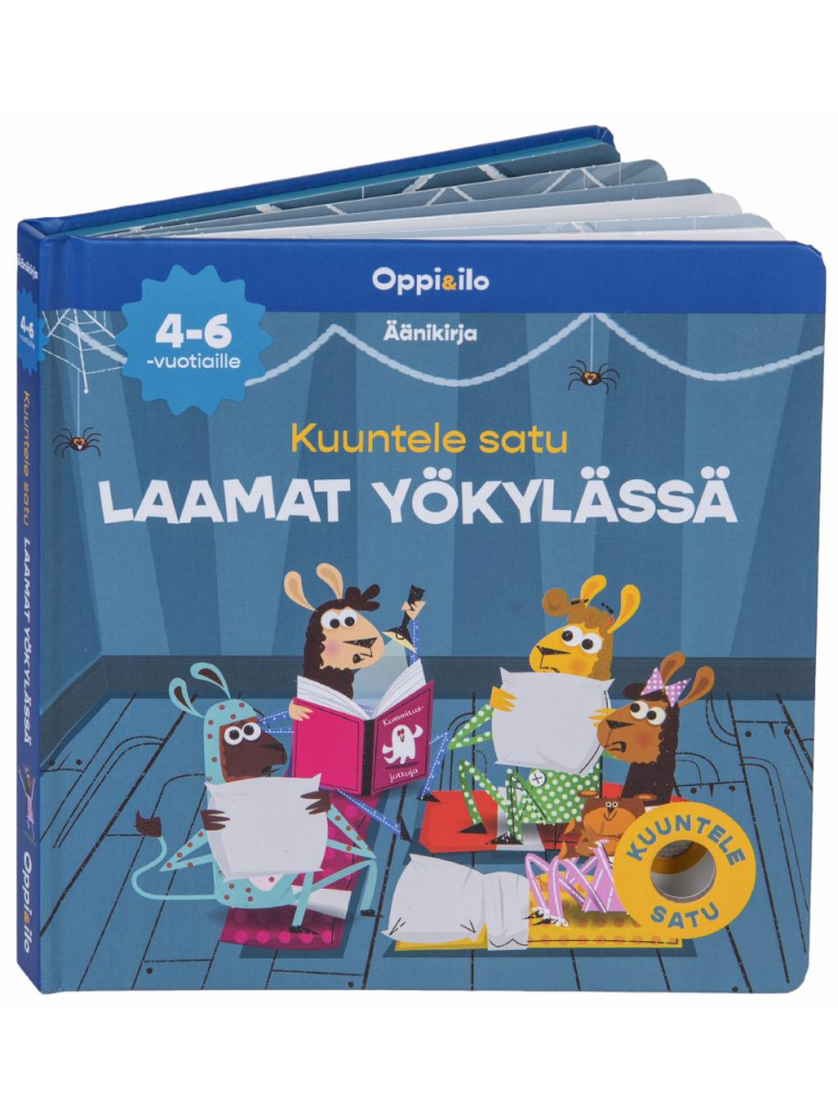 Oppi ja ilo "Laamat yökylässä" -äänikirja on tarkoitettu 4 - 6 -vuotiaille lapsille. Kiehtova äänikirja on lapsen kuunneltavissa nappia painamalla kerta toisensa jälkeen. Runomuotoinen tarina rikastuttaa lapsen sanavarastoa ja kehittää kuullun ymmärtämistä, mielikuvitusta ja keskittymiskykyä. Kirjan sivut ovat vahvaa kartonkia