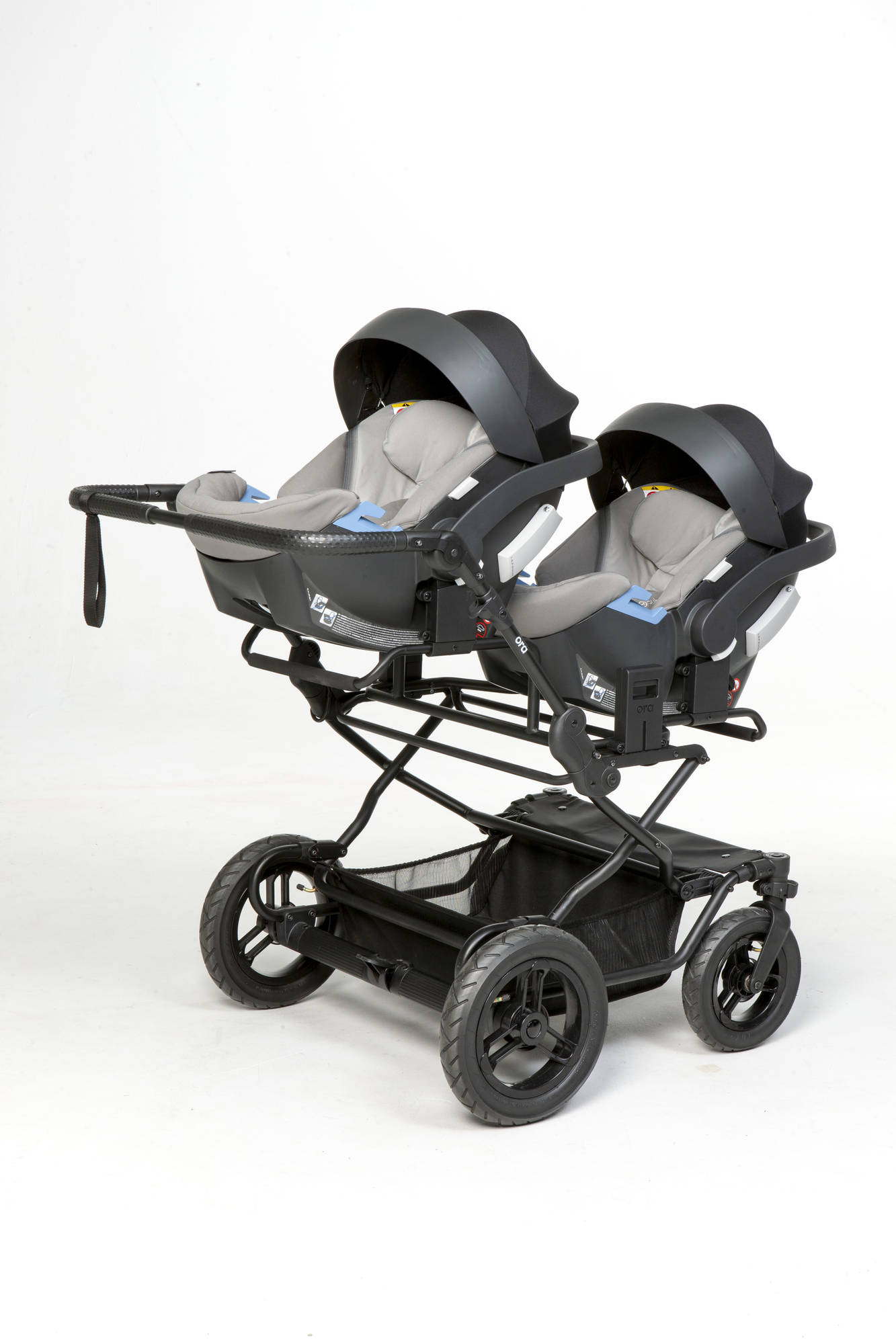 Ora Sisu adaptereiden avulla saat kiinnitettyä turvakaukalot kaksostenvaunuihin. Adapterikehikko on helppo kiinnittää ja irroittaa vaunuista tukevan lukkomekanismin avulla.