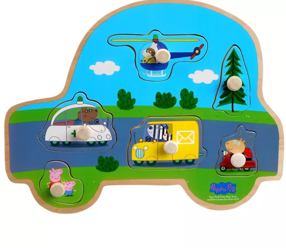 Pipsa Possu liikenne palapeli on hauska nuppipalapeli lapselle. Palapelissaä on kuusi palaa, joihin lapsen on helppo tarttua.