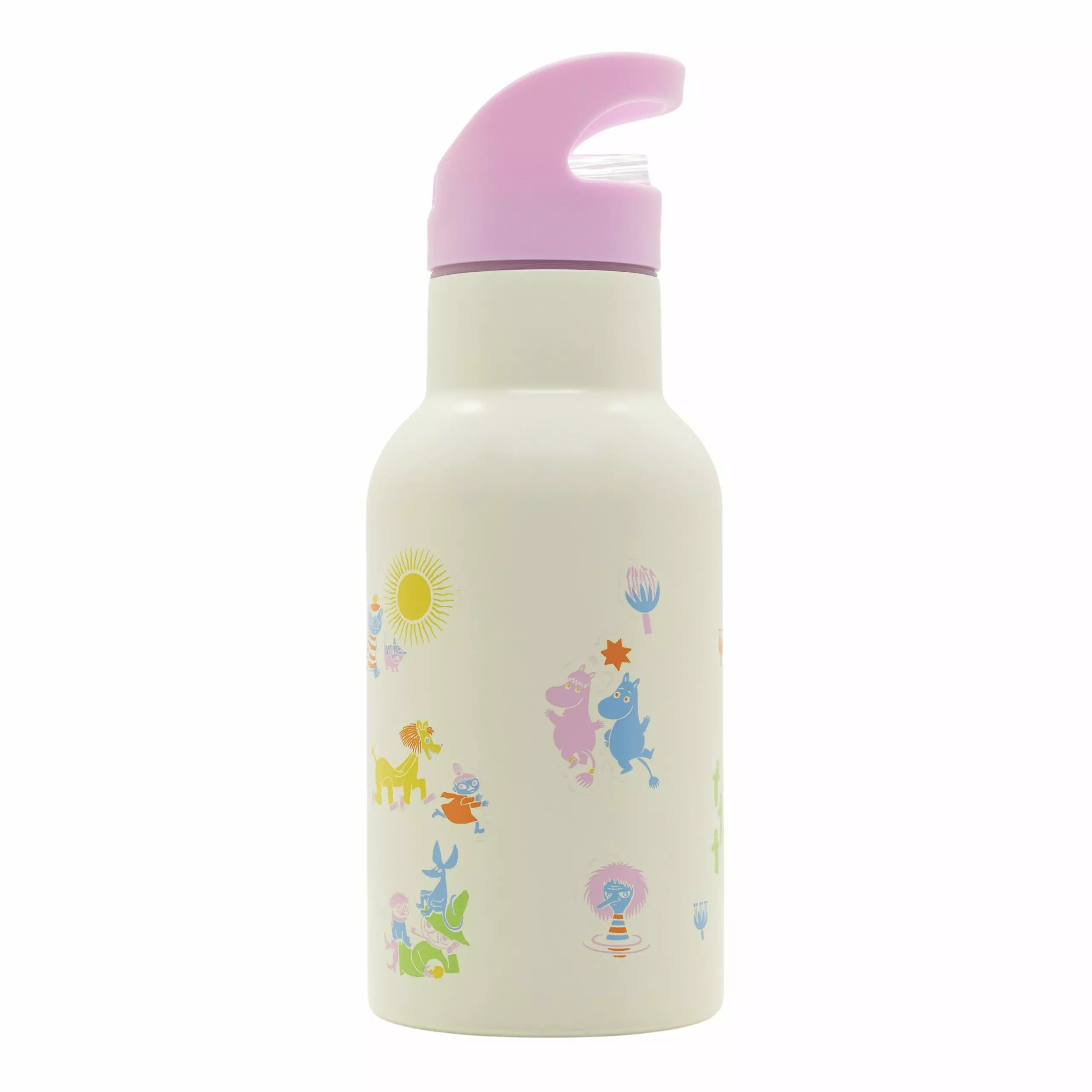 Rätt Start Muumi metallinen juomapullo on valmistettu ruostumattomasta teräksestä. Pullo säilyttää juomat viileänä tai lämpimänä. Juomapulloa on helppo kantaa pienestä kahvasta, ja sen mukana tulee muovinen pilli. Tyylikkäässä pullossa seikkailevat tutut Muumi -hahmot 80 -vuotis juhlakuosissa.