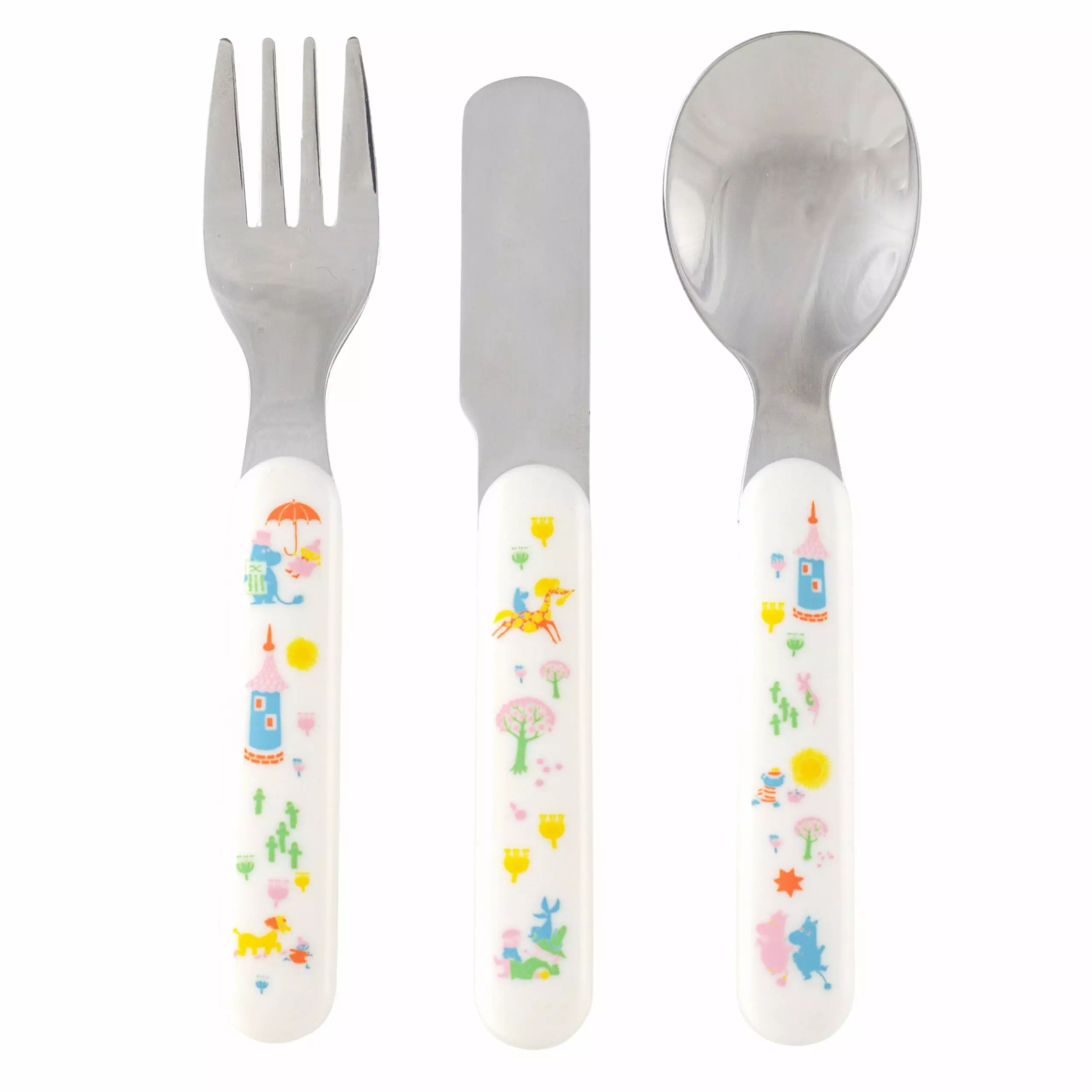 Rätt Start Muumi aterimet pakkaus sisältää ruostumattomasta teräksestä valmistetut haarukan, veitsen ja lusikan. Aterimet ovat juuri oikean kokoiset pienille, jotka opettelevat itsenäistä ateriointia. Aterimissa seikkailevat tutut Muumi -hahmot.