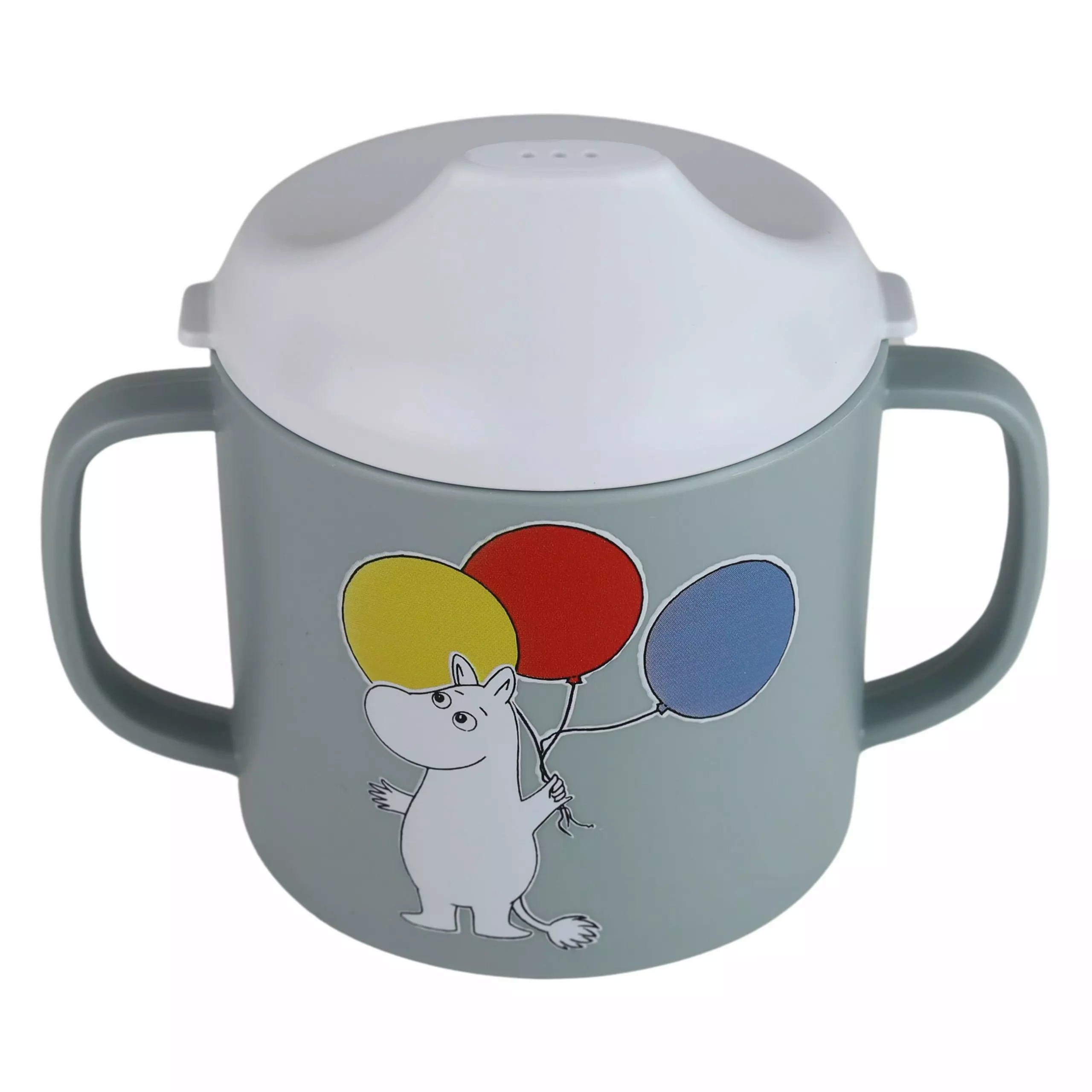 Rätt Start Muumi nokkamuki kahvoilla on kaksikahvainen muki, josta lapsi saa hyvän ja tukevan otteen. Nokkamuki on ideaali, kun lapsi alkaa harjoittelemaan itsenäistä juomista. Nokkamukista saa kannen tarvittaessa pois, jolloin se toimii mukina.