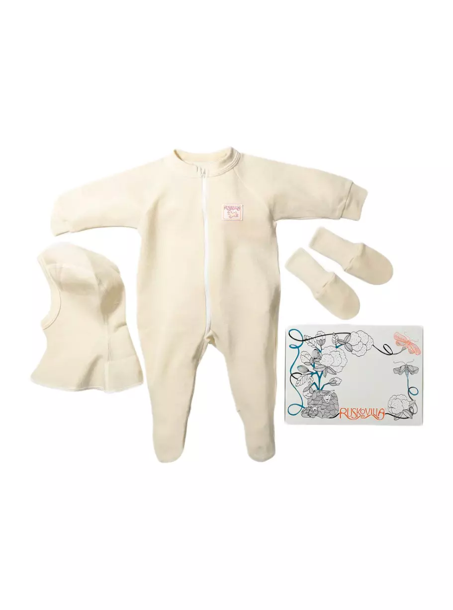 Ruskovilla vauvan ulkoilusetti 60 cm sisältää 100 % mulesing-vapaasta luomumerinovillasta valmistetun välihaalarin, kypärälakin ja ensilapaset. Välihaalari on kooltaan 60 cm, joka sopii noin 2 - 4 kk lapselle. Kypärälakki mahtuu 0 - 1 v. ja lapaset ovat ilman peukaloa ja niissä on silkkivuori.