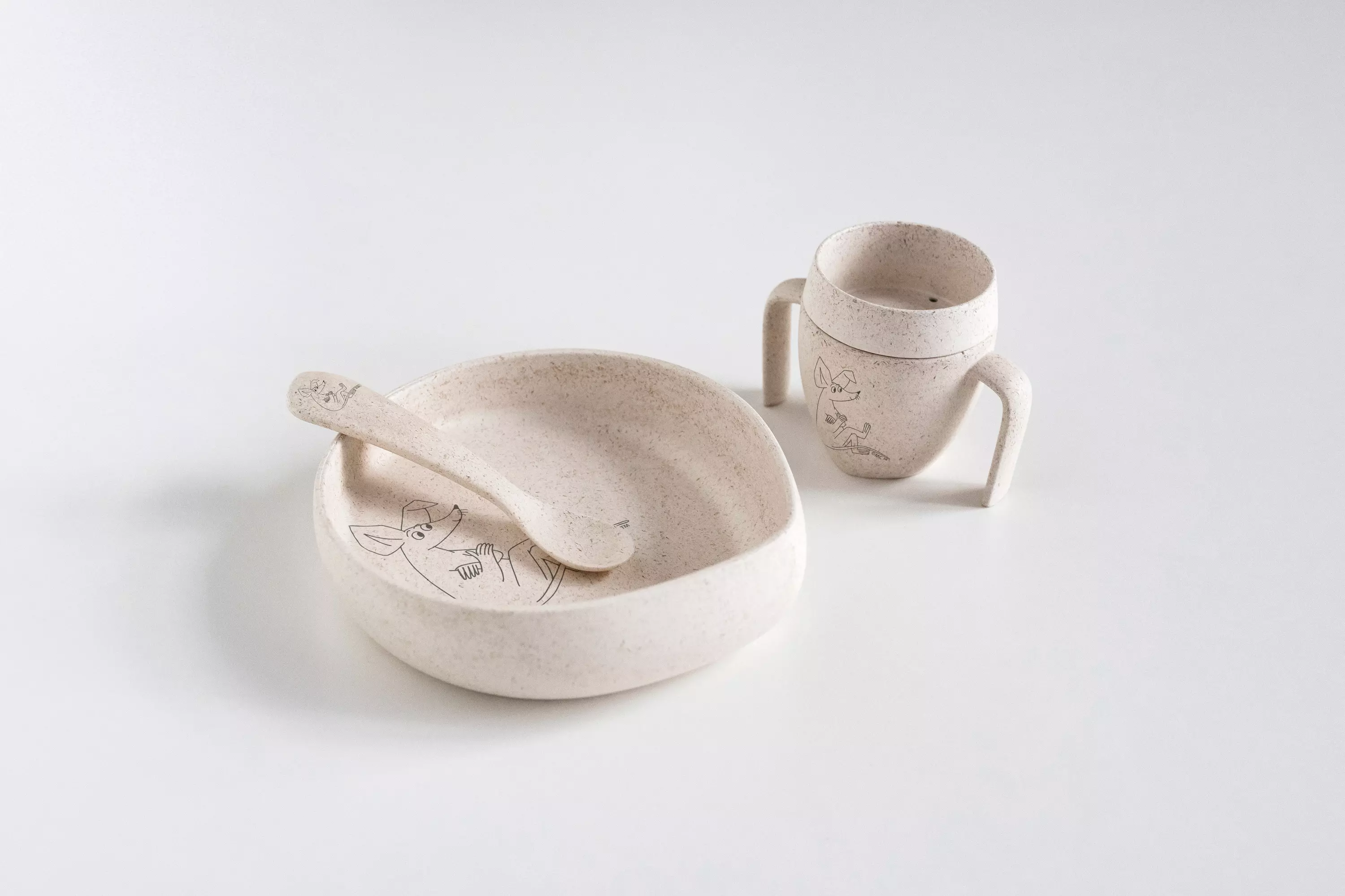Skandino EcoDesign astiasarja sisältää lautasen, kahvallisen mukin sekä lusikan. Lautasen kaltevan pohjan ansiosta ruoka kerääntyy kourumaiseen kulmaukseen, josta lapsen on helppo saada se lusikkaan. Lusikassa on pieneen suuhun sopiva pesä, sekä ergonominen ja pitkä varsi. Kahvallisesta mukista lapsi saa hyvän otteen. Mukin rajoitinkansi tukee juomisen kehittymistä turvallisesti, ja myöhemmin mukia voi käyttää ilman kantta.