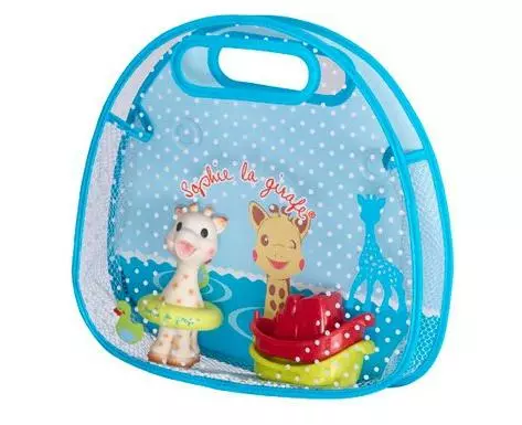 Sophie the Giraffe kylpylelusetti sisältää tutun ja suositun Sophie kirahvi kylpylelun, kaksi pinottavaa venettä sekä kätevän säilytyskorin leluille, joka saadaan kiinnitettyä seinään.