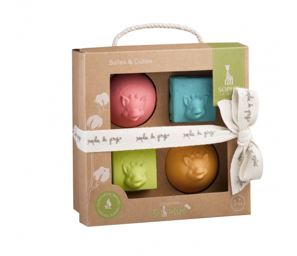 Sophie The Giraffe kuutiot & pallot pakkaus sisältää 4 kappaletaa eri muotoisia ja värisiä puruleluja lapselle. Purulelut on valmistettu 100% luonnonkumista. Tuotteissa on erilaisia kohokuviointeja ja pintoja, joihin lapsi voi hieroa kutiavia ikeniään.