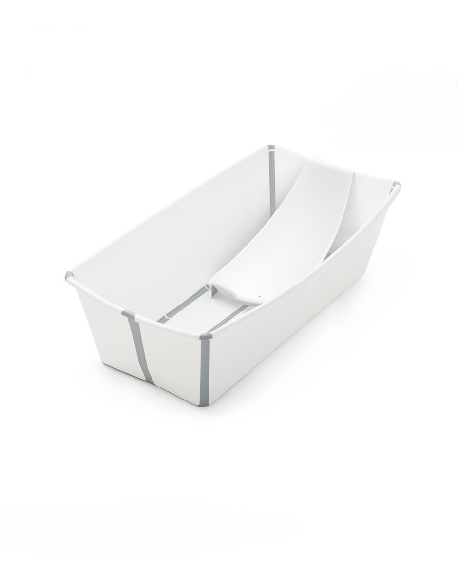 Stokke Flexi Bath XL kokoontaittuva amme ja Flexi Bath kylvetystuki 0-8kk ikäiselle lapselle. Flexi Bath XL on suurempi kokoinen amme suositusta kokoontaittuvasta Flexi Bath ammeesta. Flexi Bath XL amme kasautuu pieneen tilaan ja on ihanteellinen säilytettäväksi niin kotona, matkoilla kuin mökilläkin. XL amme sopii vastasyntyneestä noin kuusi vuotiaaksi asti. Kaksi lasta mahtuu XL ammeeseen helposti kylpemään yhdessä.