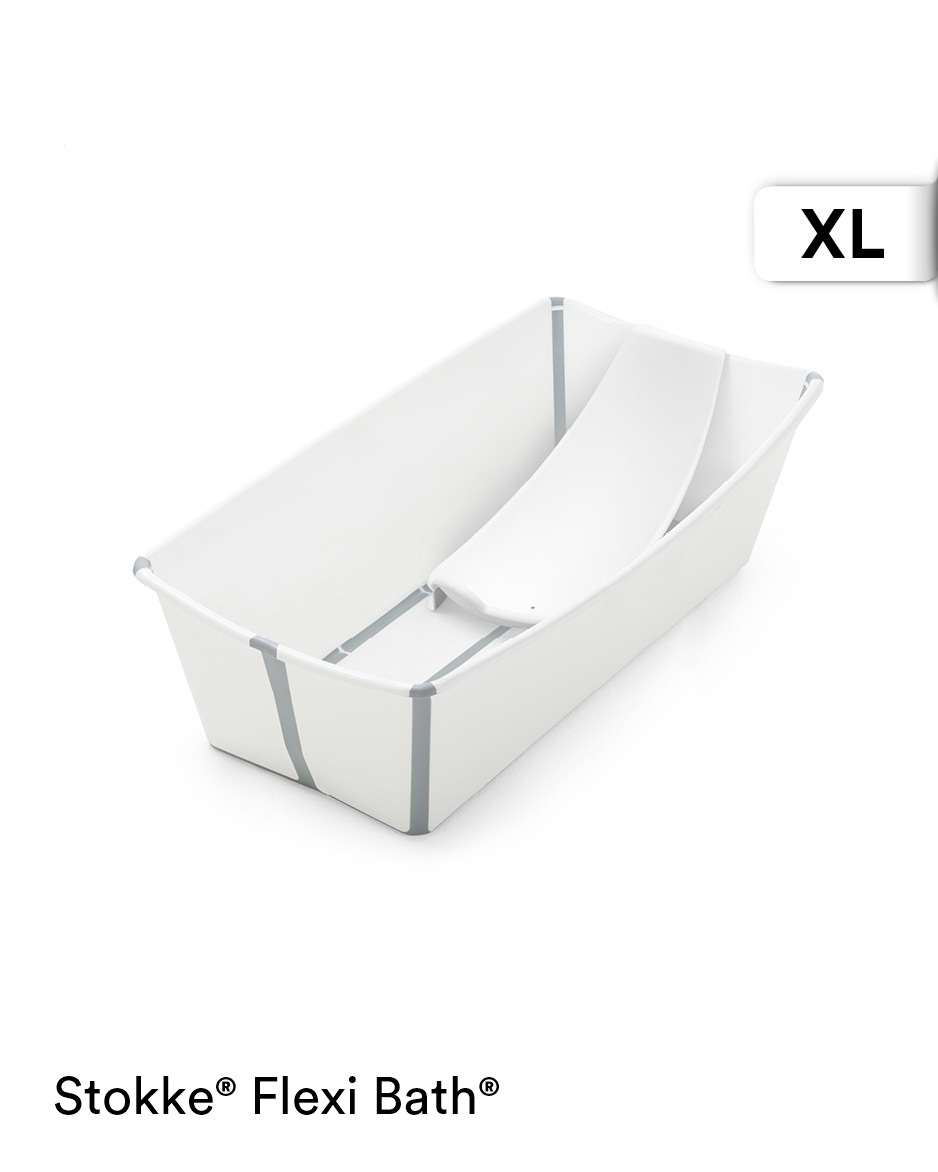 Stokke Flexi Bath XL kokoontaittuva amme ja Flexi Bath kylvetystuki 0-8kk ikäiselle lapselle. Flexi Bath XL on suurempi kokoinen amme suositusta kokoontaittuvasta Flexi Bath ammeesta. Flexi Bath XL amme kasautuu pieneen tilaan ja on ihanteellinen säilytettäväksi niin kotona, matkoilla kuin mökilläkin. XL amme sopii vastasyntyneestä noin kuusi vuotiaaksi asti. Kaksi lasta mahtuu XL ammeeseen helposti kylpemään yhdessä.
