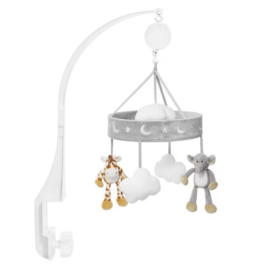 Teddykompaniet Diinglisar mobile on pinnasängyn laitaan kiinnitettävä mobile, joka tuudittaa lapsen uneen. Mobilesta roikkuu pehmeät elefantti ja kirahvihahmot sekä kaksi vaaleaa pilveä.