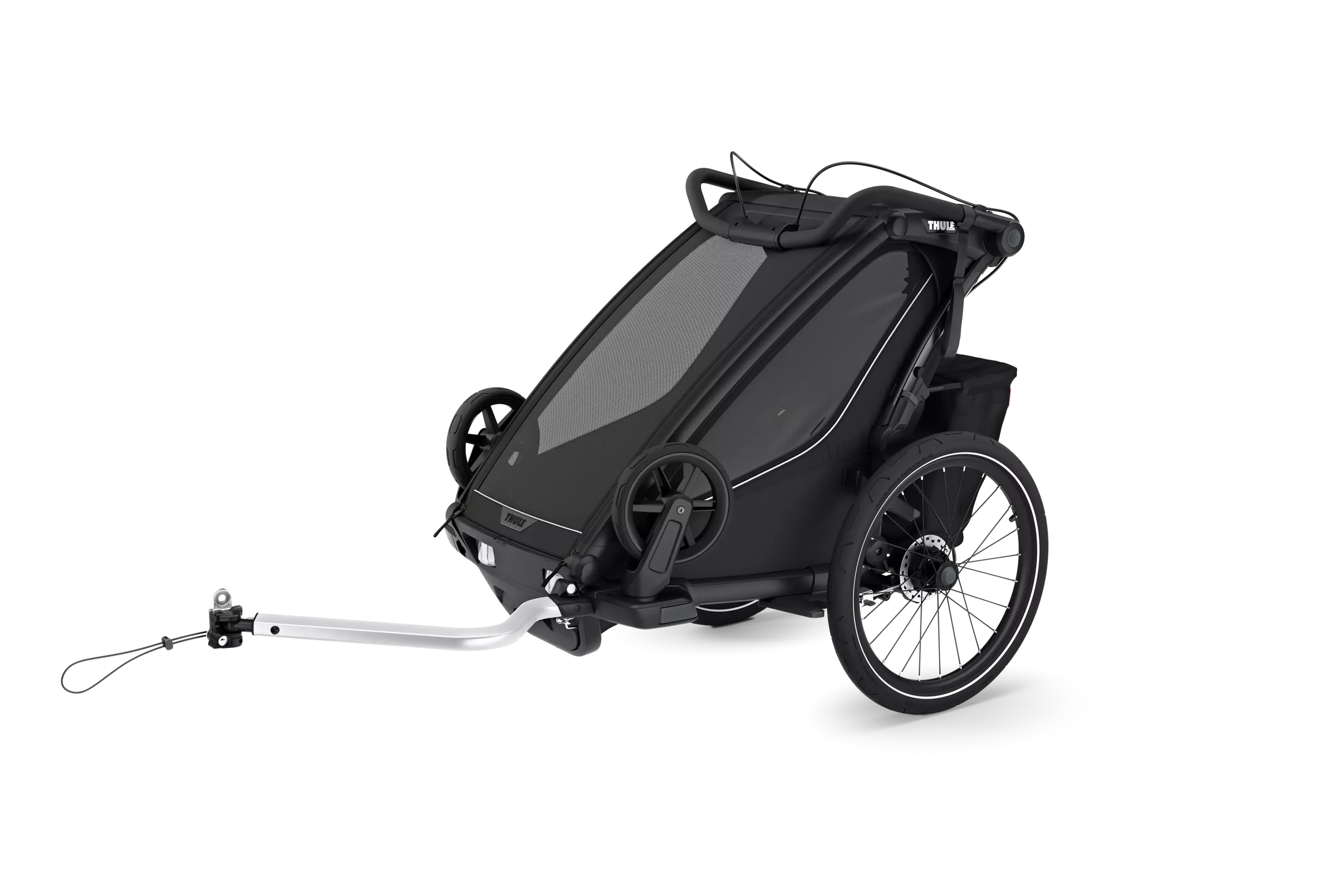 Käsikäyttöinen levyjarru parantaa rattaan hallittavuutta jyrkissä mäissä ja juoksulenkeillä. Integroitu LED-takavalo tuo lisää näkyvyyttä ja turvallisuutta, ja antaa tyylikkään vaikutelman. Uuden vetoaisan ansiosta kärry saadaan kiinnitettyä helposti ja turvallisesti polkupyörään yhdellä kädellä. Uudistettu Flip Wing-järjestelmä helpottaa vaihtoa kävelyn ja pyöräilyn välillä, sillä pyörät saa käännettyä ylös ja alas urheilukärryn ollessa kiinnitetty polkupyörään. Ergonominen ja säädettävä ohjaustanko takaa vanhemmalle parhaan mahdollisen mukavuuden. Thule Click n' Storen avulla lenkkeily- ja pyöräilyvarusteet voidaan varastoida kätevästi, kun niitä ei tarvita.