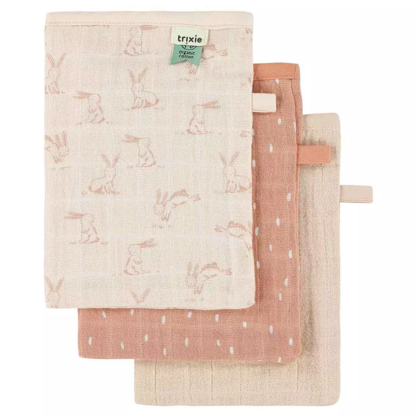 Trixie pesulaput 3 kpl sisältää kolme erilaista pesulappua, jotka ovat valmistettu pehmeästä musliinikankaasta. Pesulaput voidaan pestä 30 asteessa.