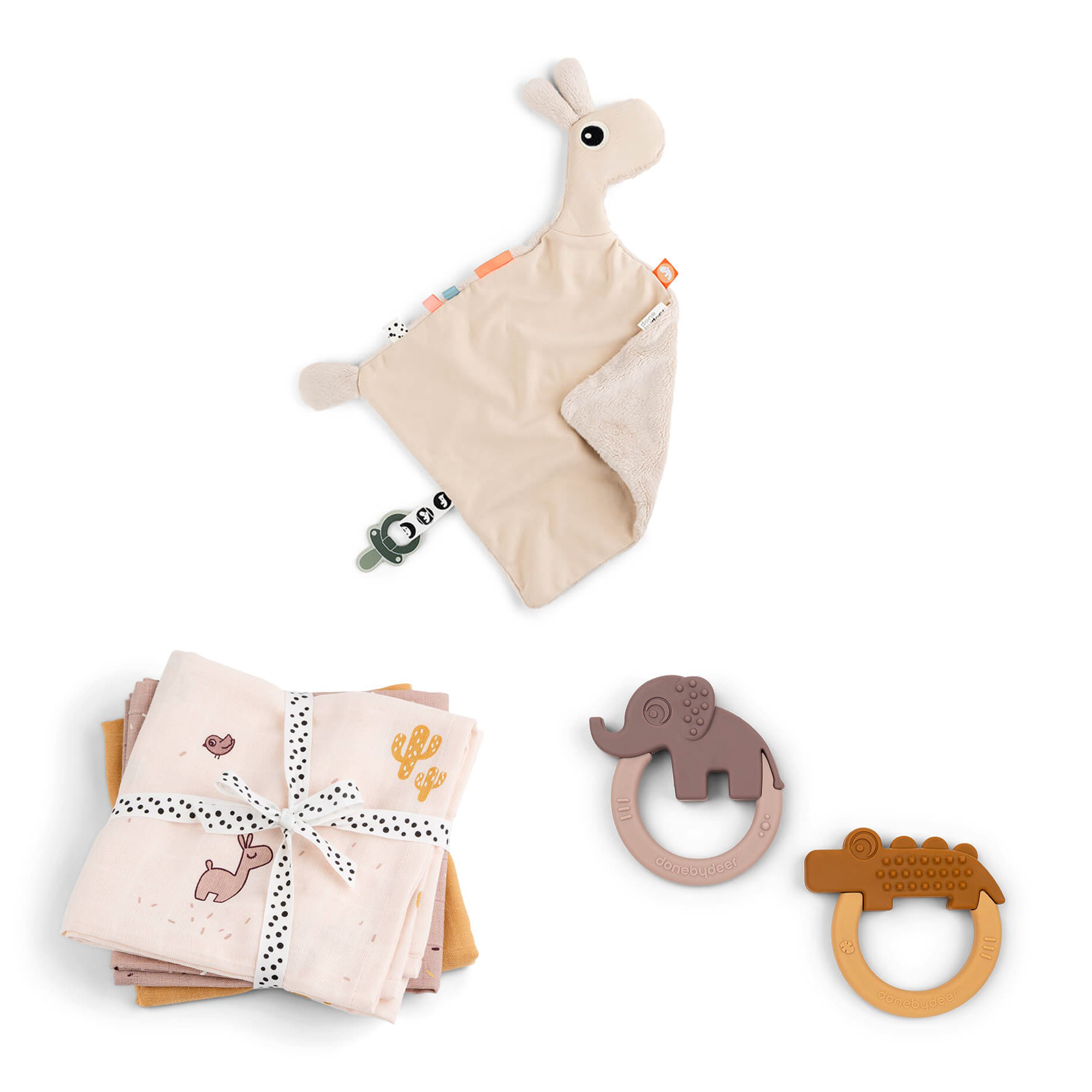 Done by Deer tuotepaketti vauvalle sisältää uniliinan, harsopaketin sekä kaksi purulelua. Cozy blanket uniliina "Lalee Sand" on todella monipuolinen ja pehmeä uniliina, jossa on useita ominaisuuksia. Uniliinassa on kaksi eri tuntoista puolta ja siinä on myös erilaisia lappuja, joita pieni lapsi voi tunnustella. Uniliinan sivulla on tarranauhallinen lenkki, johon renkaallisen tutin saa kiinnitettyä ja näin lapsi löytää tutin helpommin itse myös pimeässä.